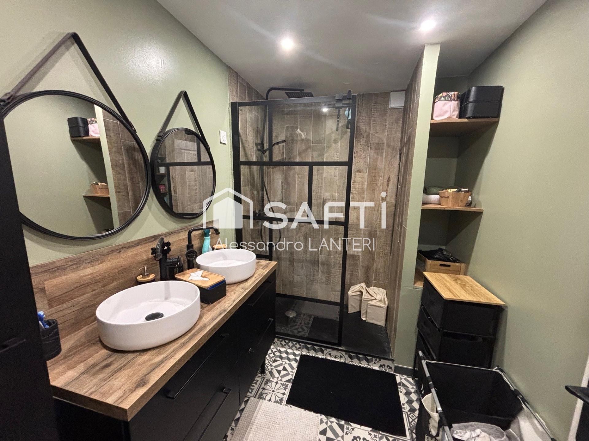 Au rez-de-chaussée vous trouverez une entrée desservant salon et salle à manger ouvert sur une grande cuisine, une buanderie avec espace machine à laver et sèche linge, un espace rangement supplémentaire sous les escaliers, un wc séparé et une grande douche à l'italienne avec double vasque.