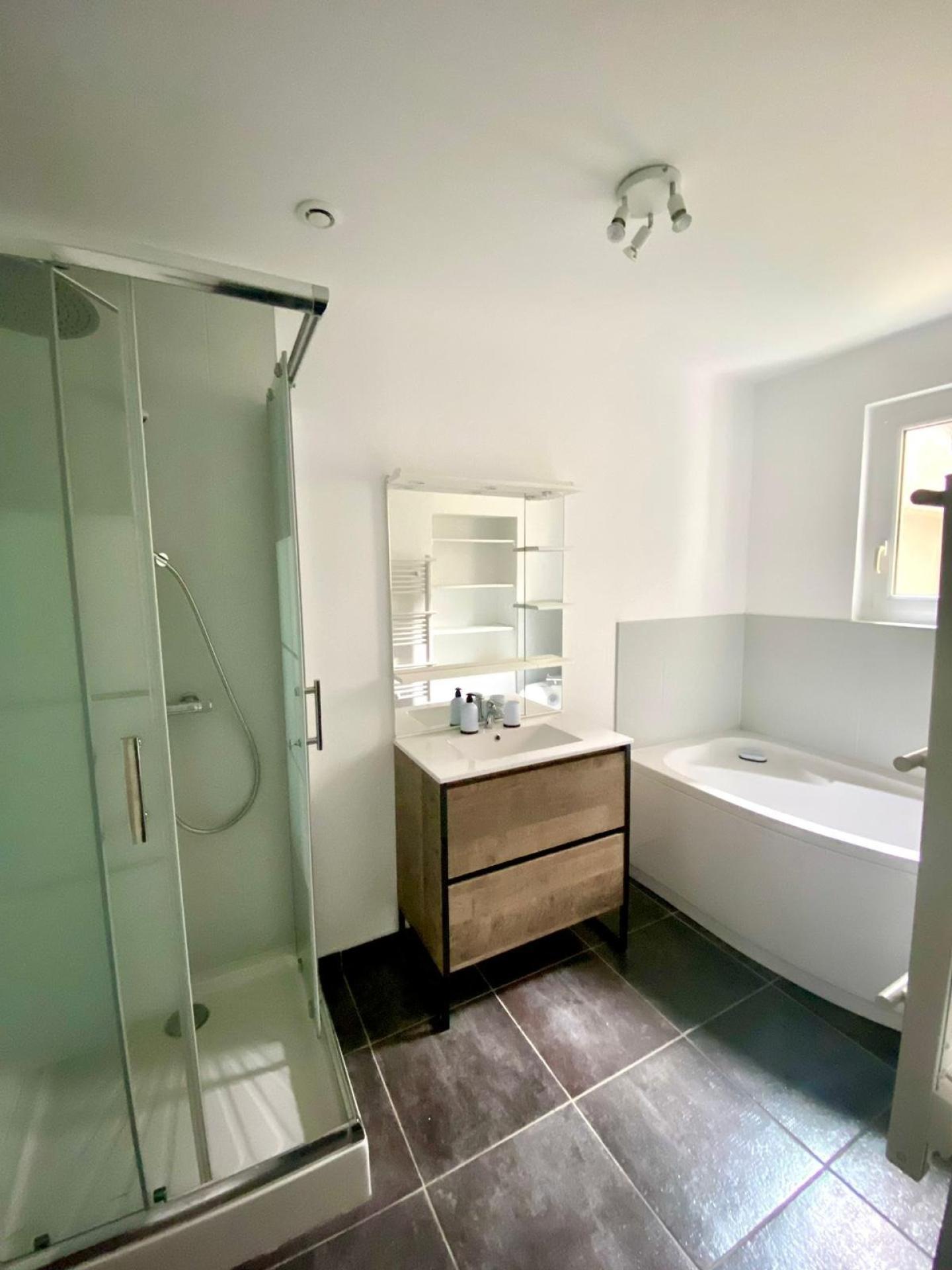 Une salle de bain complète, avec baignoire et douche