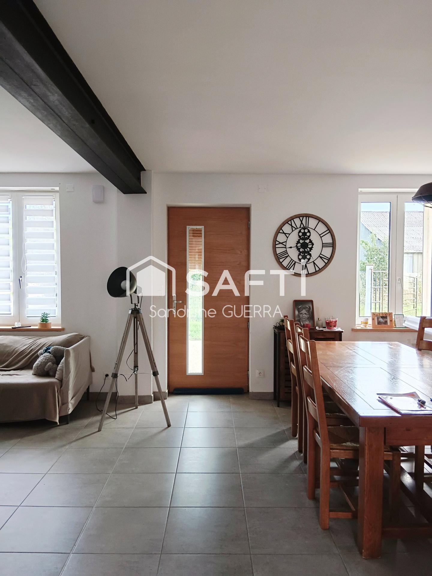 À l'intérieur, la maison de 126 m² se compose de cinq pièces soigneusement aménagées. Au rez-de-chaussée, une cuisine équipée et meublée, ouverte sur un lumineux salon séjour, un bureau, une salle de bain avec baignoire et douche, ainsi qu'un WC. À l'étage, deux grandes chambres et un WC. Les équipements modernes tels que le poêle à granulés, le double vitrage en PVC et la VMC assurent un confort optimal. Avec son potentiel intéressant, cette propriété pourrait également convenir à une activité de chambres d'hôtes ou à un artisan.