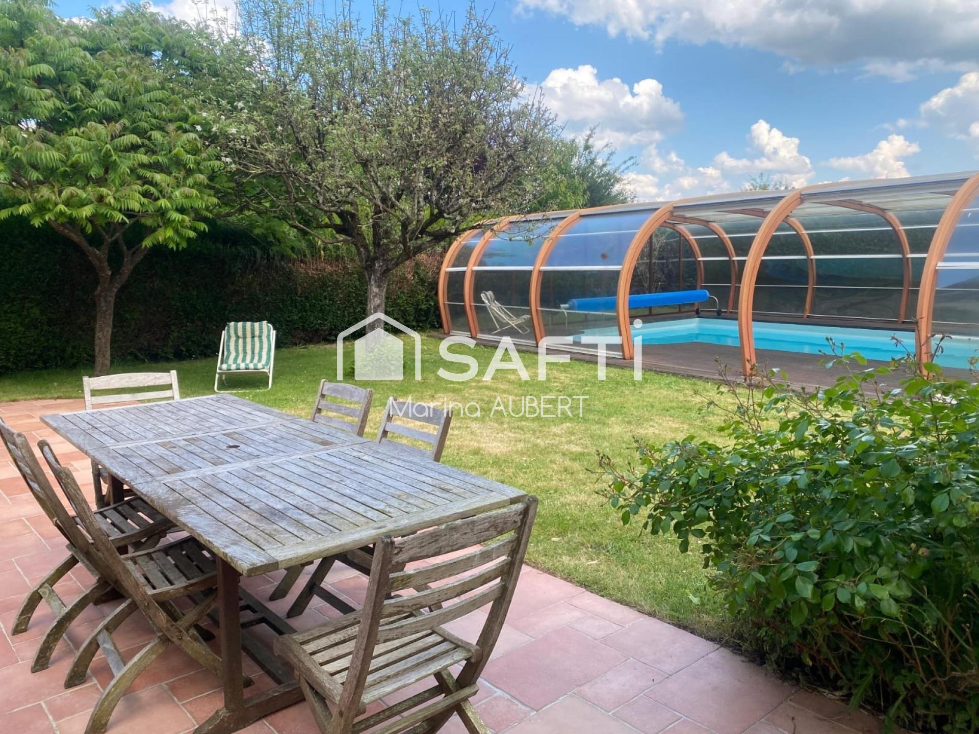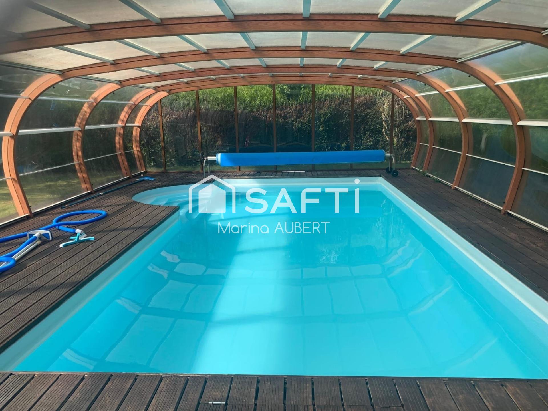 A l'extérieur, une terrasse de 25m² avec store sur toute la longueur donnant vue sur une belle piscine (8x4m) sous un abri très spacieux (11x7m) qui vous permettra d'en profiter toute l'année