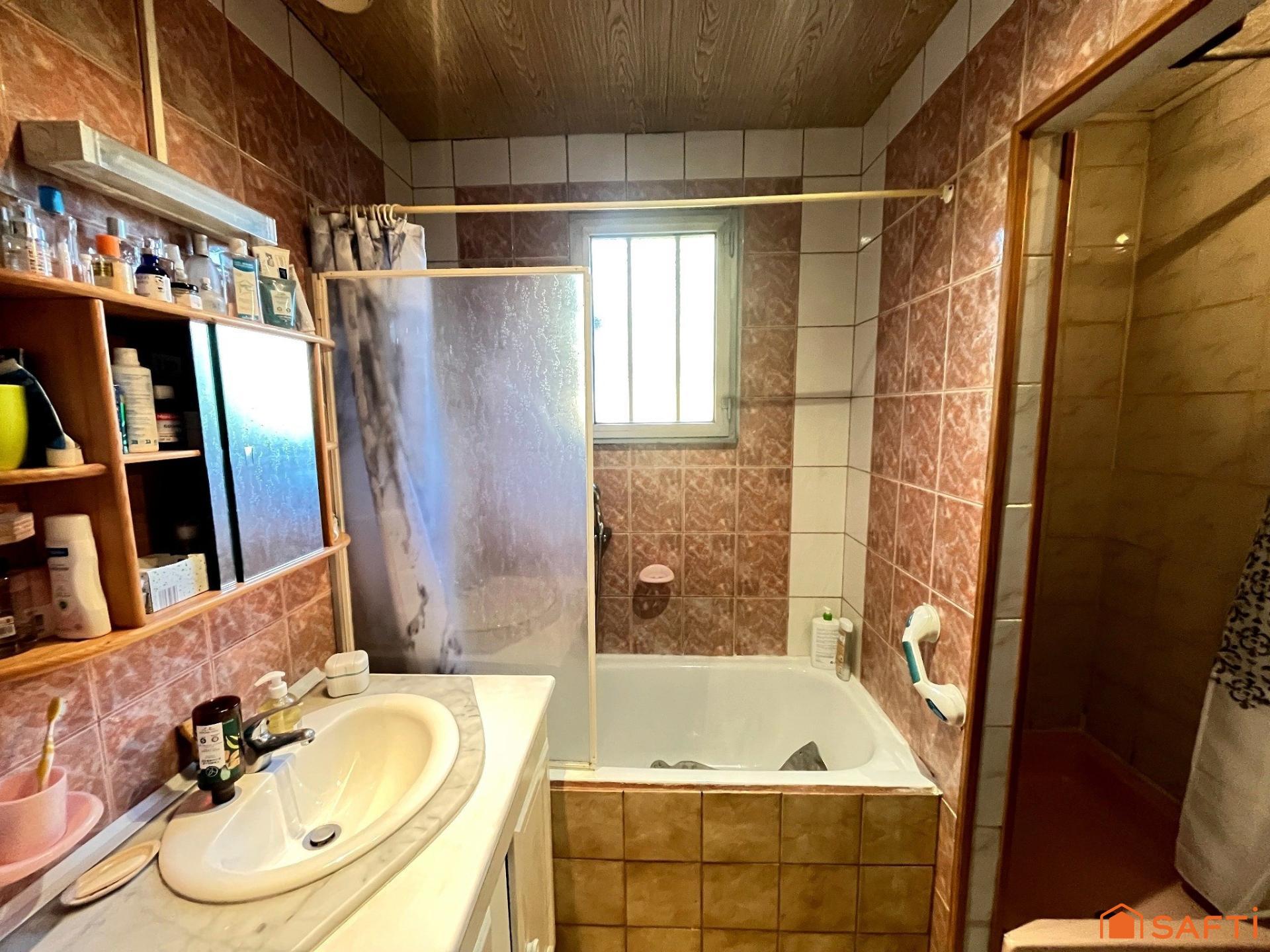Le rez-de-chaussée comprend un séjour lumineux, une cuisine avec espace repas, une salle de bain équipée d’une baignoire et d’une douche, deux chambres ainsi qu’une pièce pouvant servir de bureau ou de rangement. Cette organisation permet de vivre principalement au rez-de-chaussée tout en conservant des espaces supplémentaires à l’étage.
