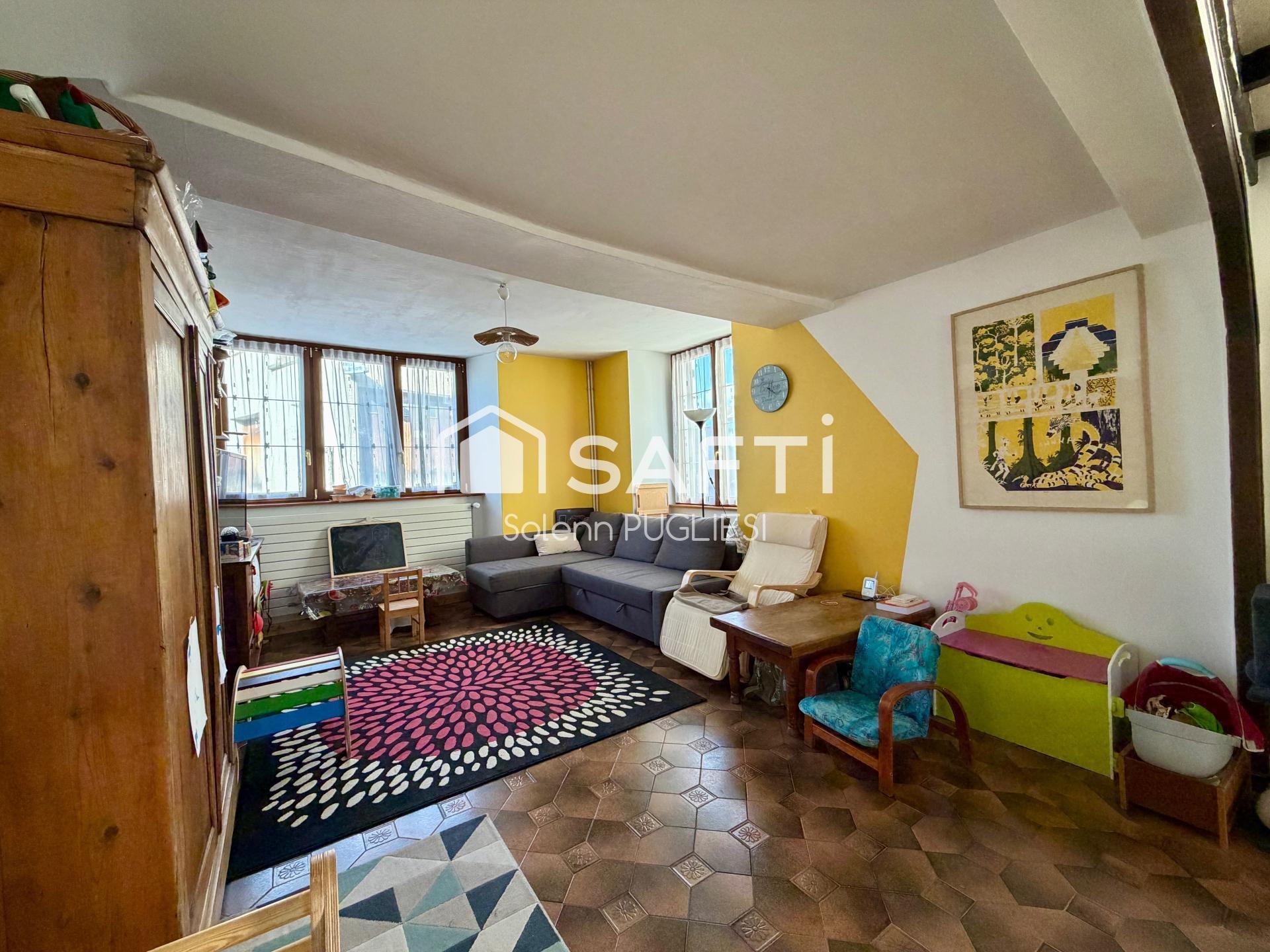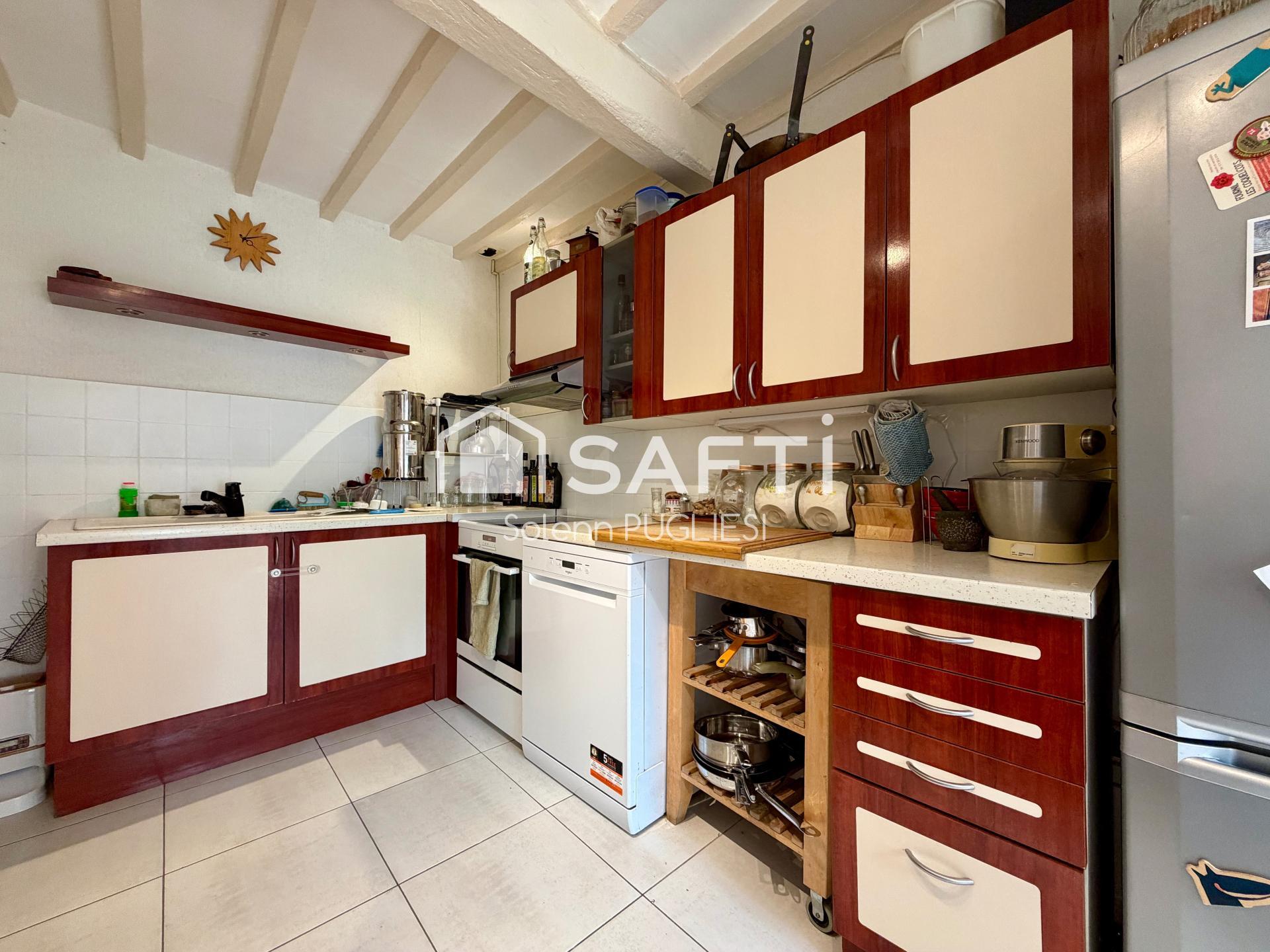 À l'intérieur, cette maison mitoyenne en pisé de 136 m² propose une distribution harmonieuse en cinq pièces, comprenant au rez-de-chaussée un hall, une cuisine équipée, une buanderie, une salle d'eau, et une vaste pièce de vie lumineuse. À l'étage, trois chambres dont une avec mezzanine, deux bureaux ou petites chambres, une salle d'eau avec WC intégrés offrent des espaces confortables et fonctionnels.