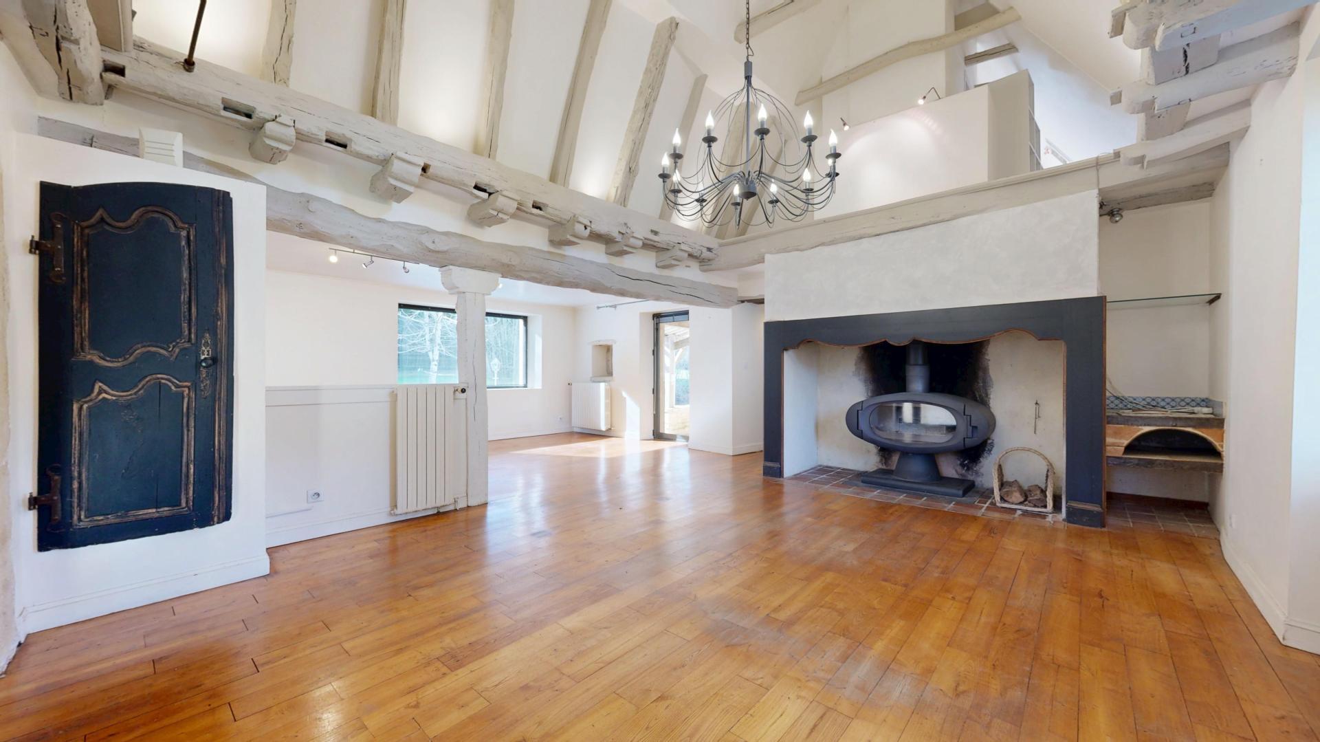 La pièce de vie avec poutres apparentes, cantou et poêle, apporte chaleur et authenticité à l'ensemble.