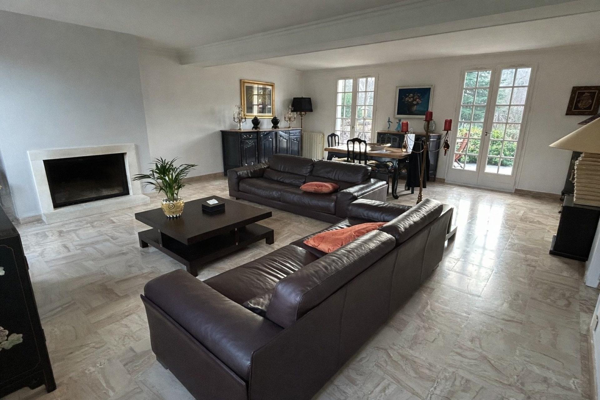 Très grandes pièces de vie, salon avec cheminée insert, baigné de lumière et ouvrant sur deux terrasses, idéales pour profiter pleinement du jardin.