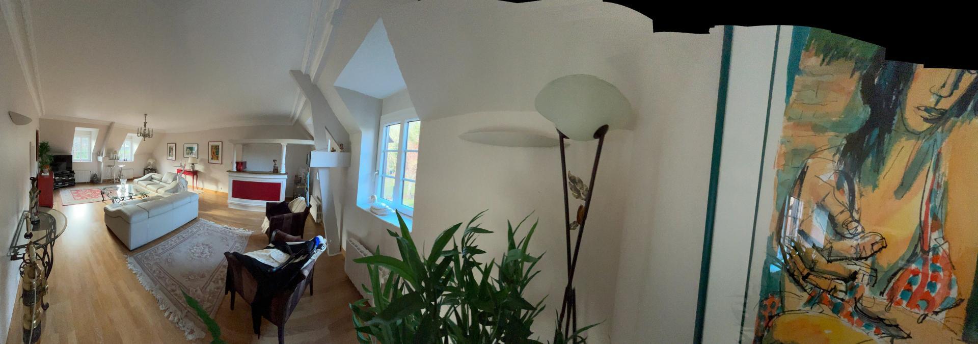 Volumes exceptionnels, très lumineux, jardin arboré de 1 500 m², terrasses, stationnements multiples, secteur calme et recherché.