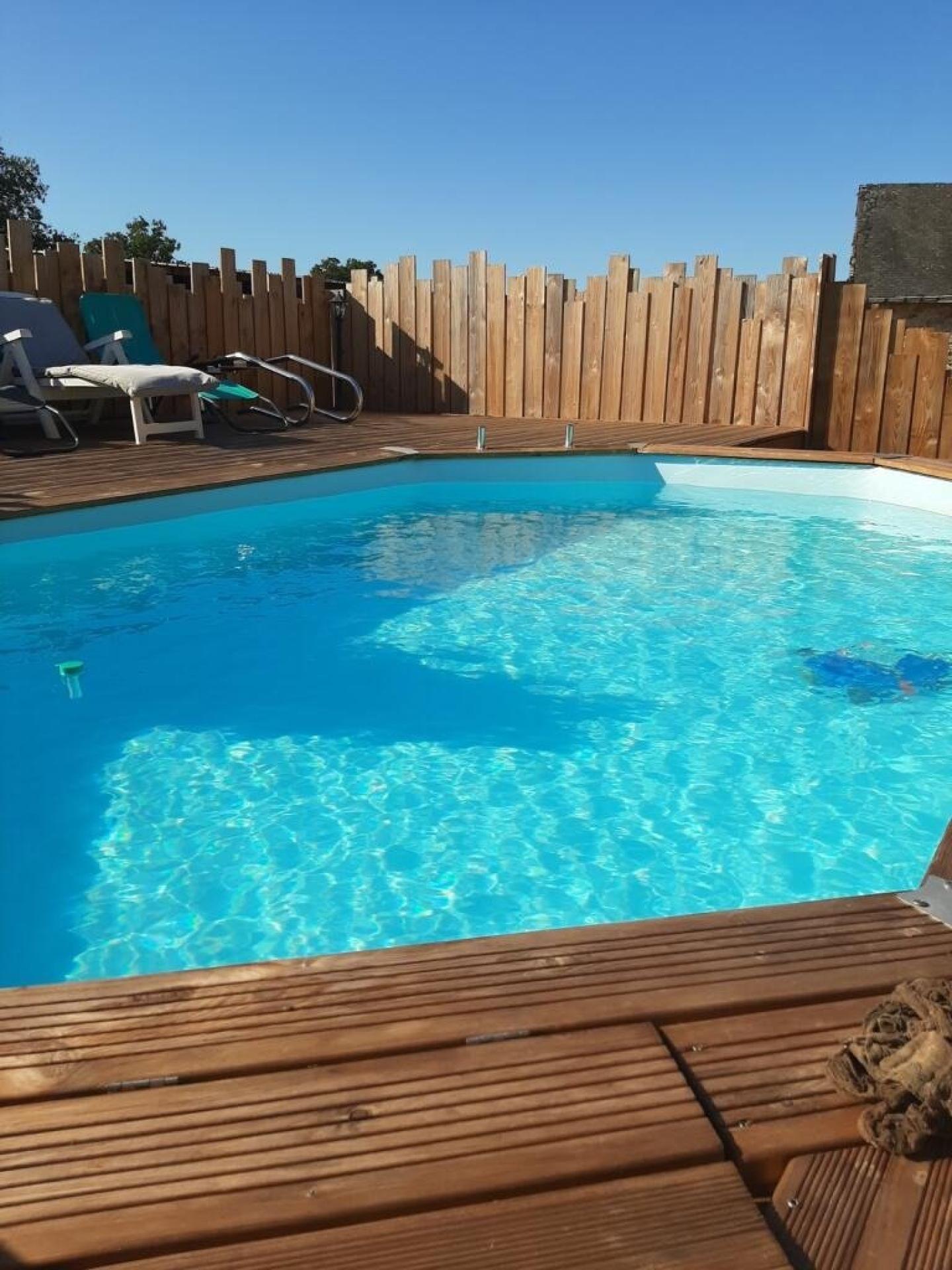 Piscine semi-enterrée avec terrasse bois, jacuzzi et pergola : un espace détente idéal aux beaux jours.