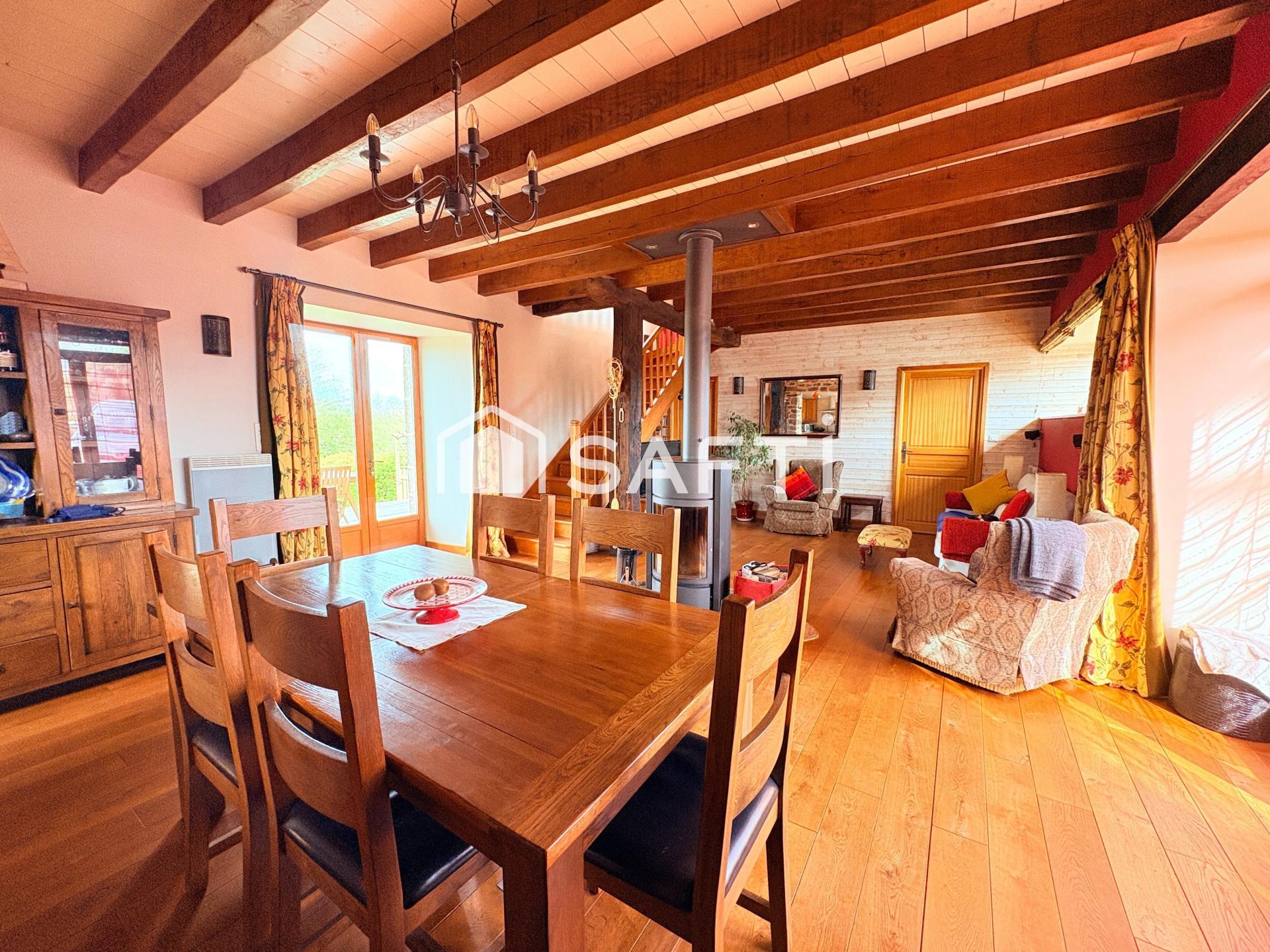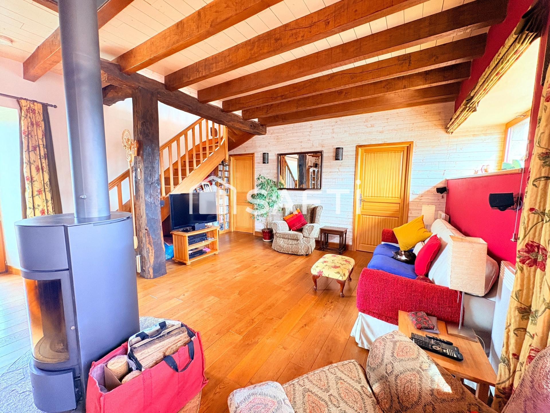 Vous découvrirez ensuite une grande pièce de vie de 38 M2, lumineuse, et chaleureuse grâce à son authenticité, et équipée d'un poêle à bois. Les poutres bois apparentes, le sol en chêne massif et le mur en pierre confèrent une sensation de cocooning et on s'y sent bien !