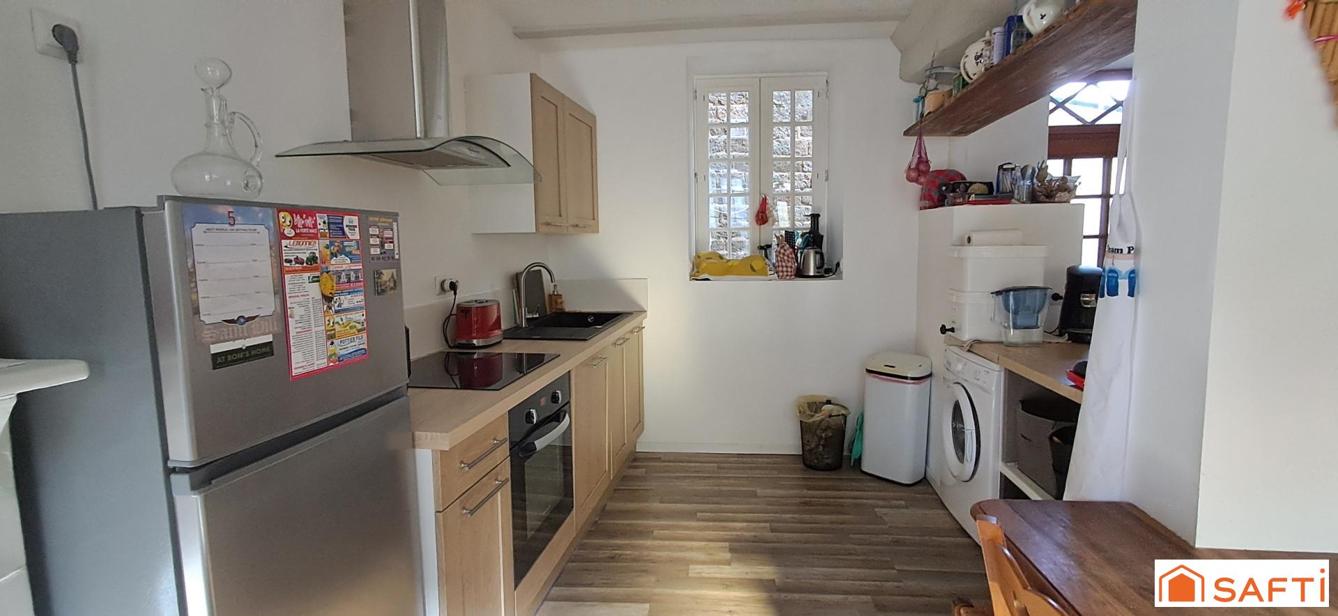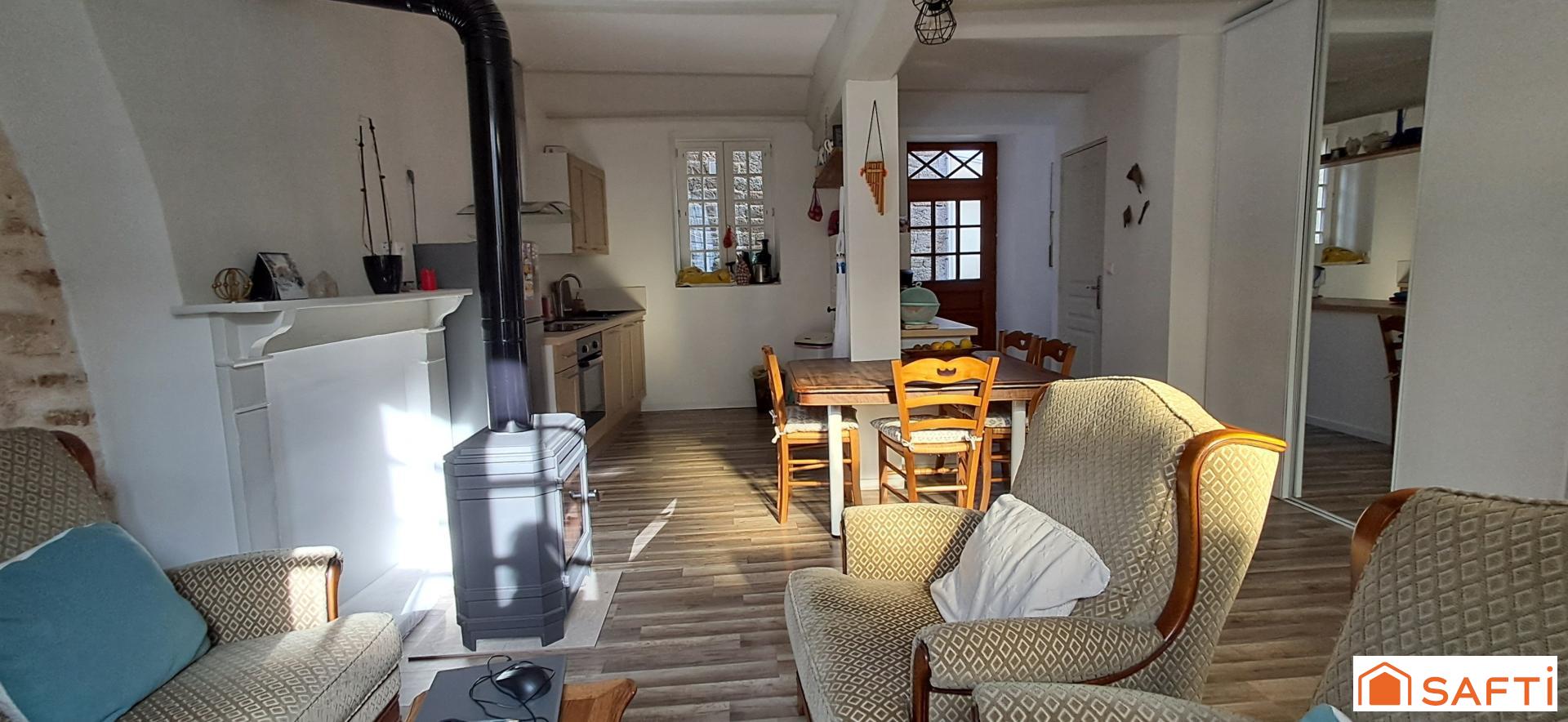 Cette maison en pierres, d'une superficie de plus de 120 m²habitable, propose un espace de vie chaleureux comprenant une pièce à vivre lumineuse avec cuisine ouverte et un poêle à bois.
