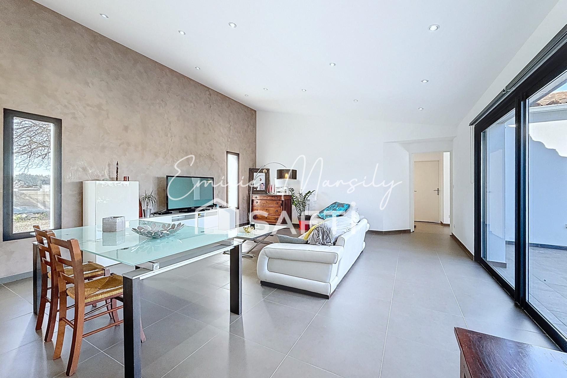 Une pièce de vie exposée plein sud, baignée de lumière, cuisine avec îlot central et buanderie attenante.