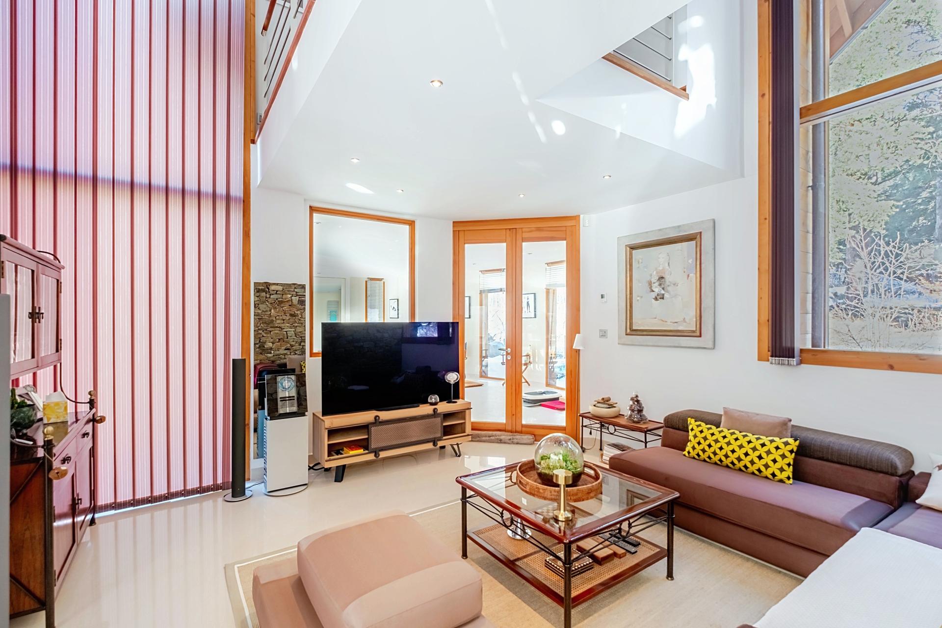 Bois, pierre, volumes spectaculaires : un salon cathédrale baigné de lumière, ouvert sur terrasses et jardin paysager.