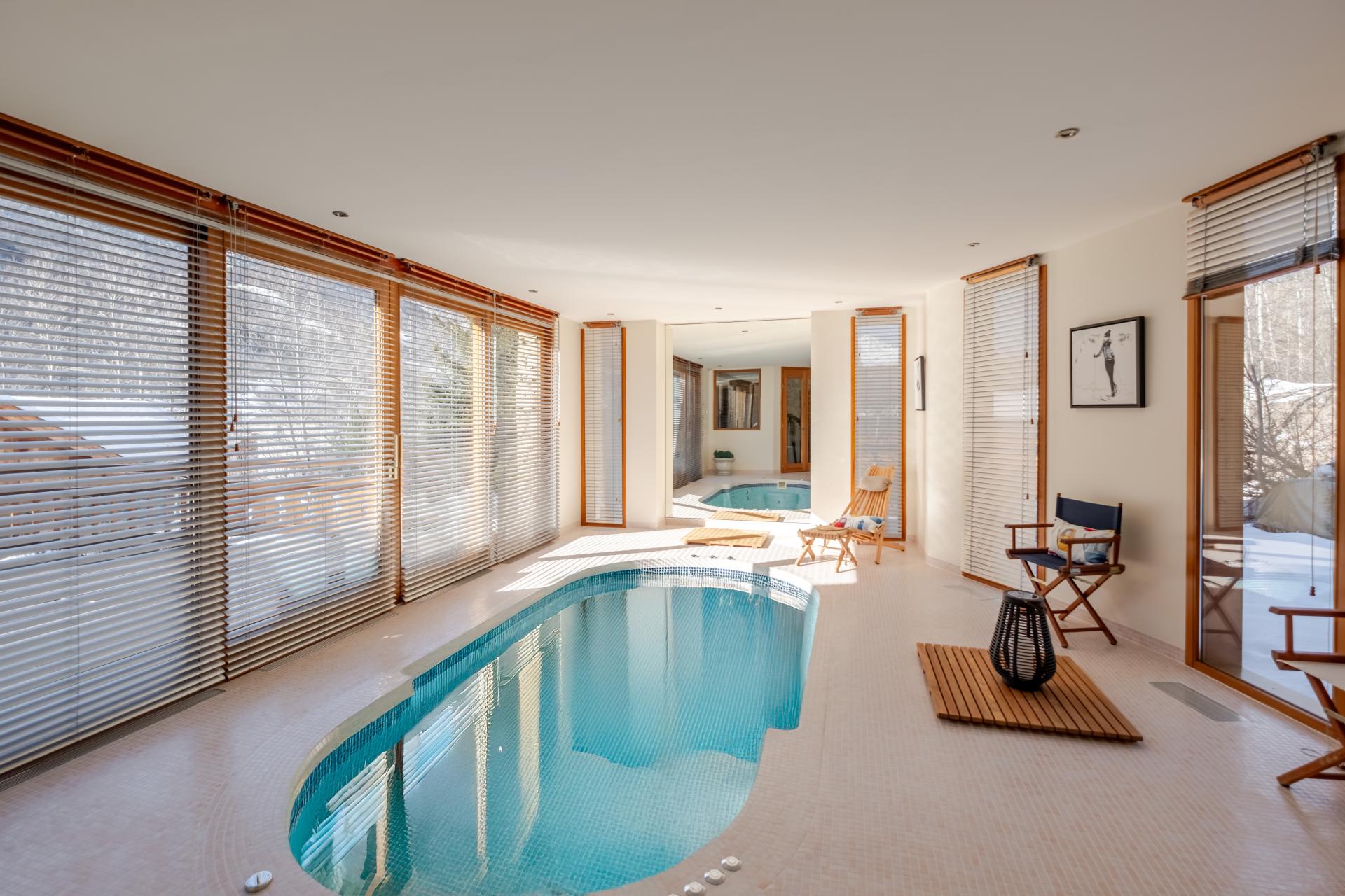 Le détail qui fait la différence : une piscine intérieure avec nage à contre-courant, lumineuse, ouverte sur la nature.