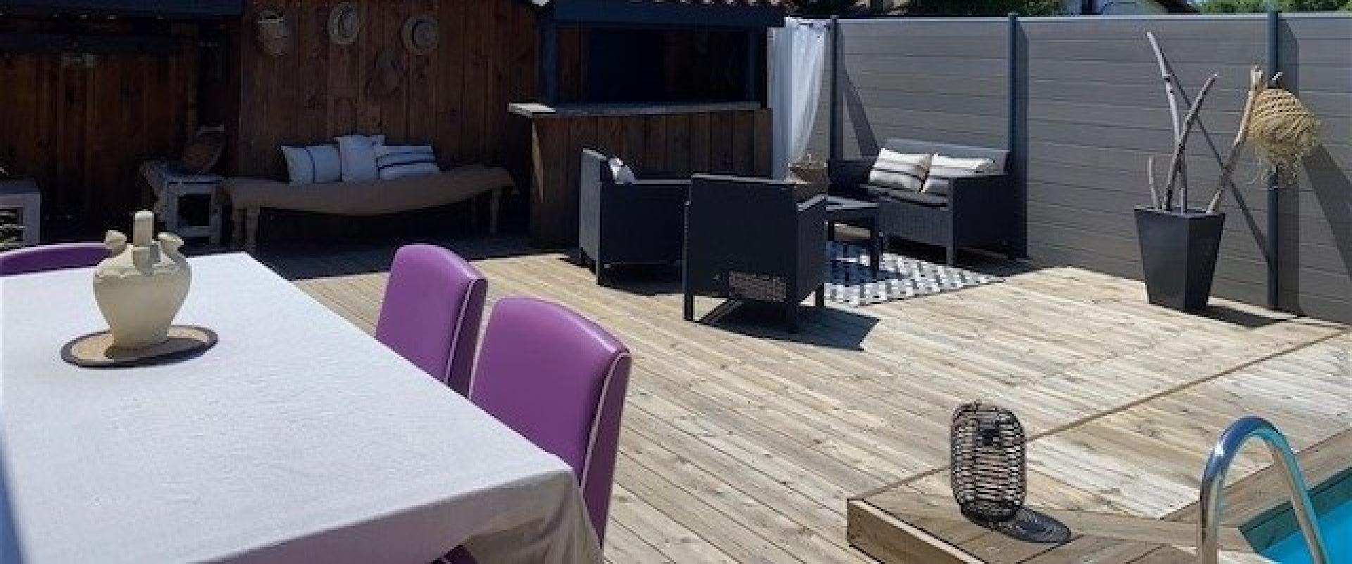 A l'extérieur, vous profiterez d'une terrasse en bois aménagée avec bar, d'une piscine, le tout dans un cadre préservé et convivial sans vis-à-vis !