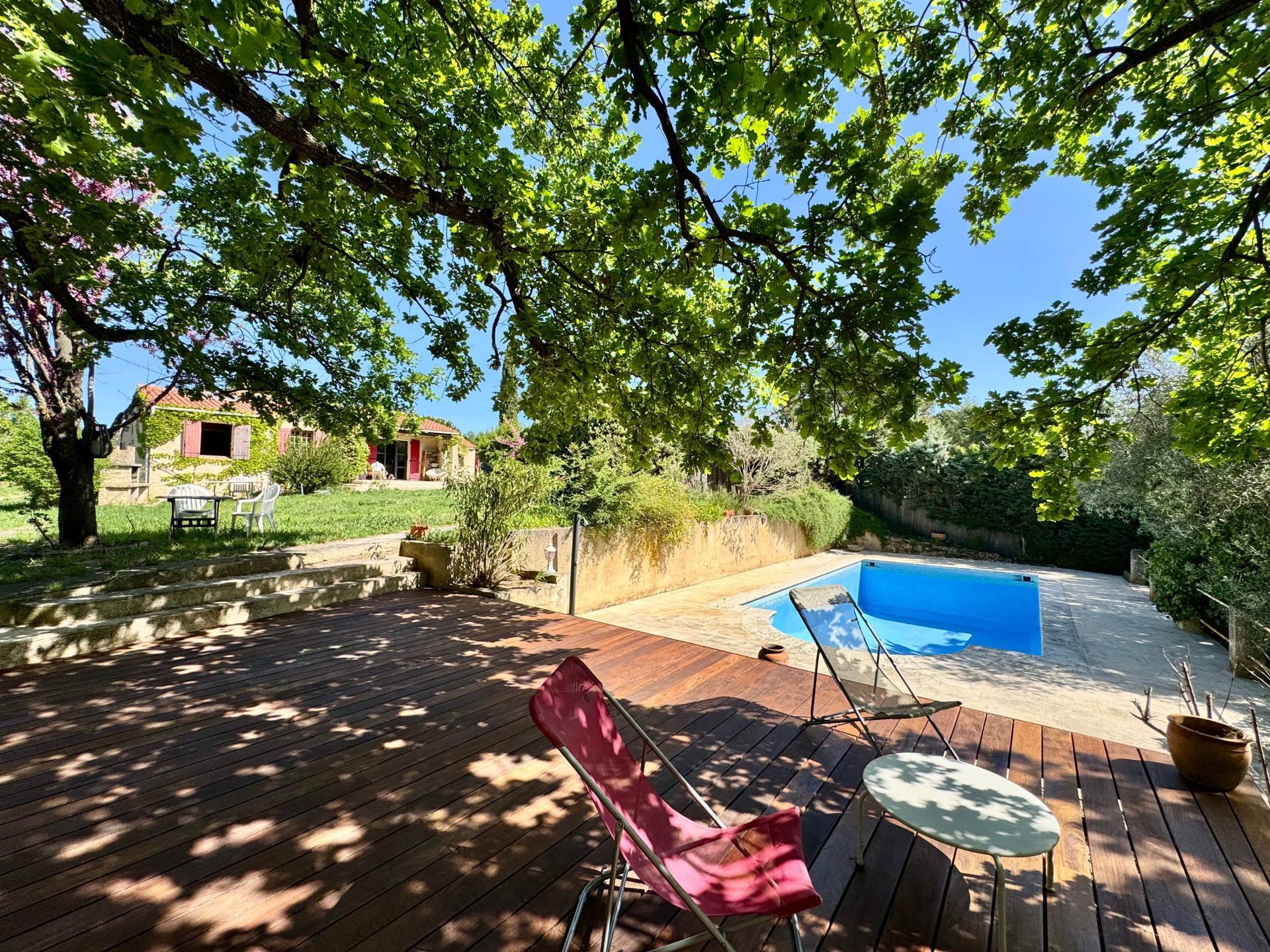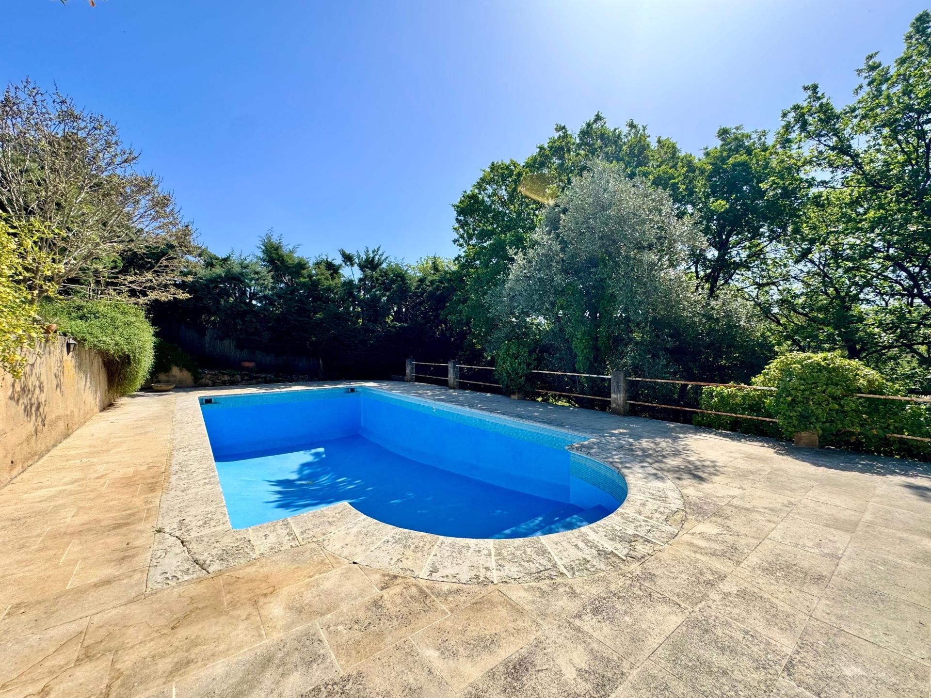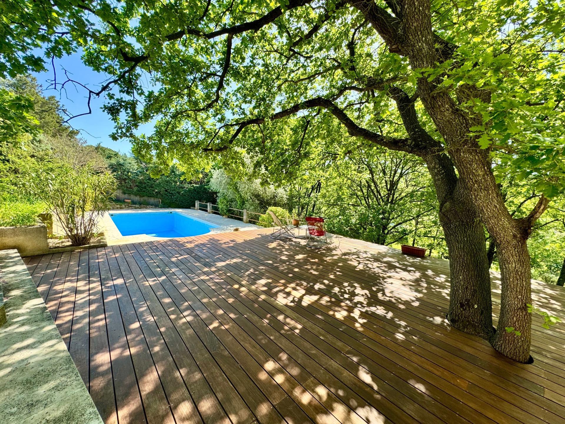 Terrain arboré , piscine traditionnelle, terrasse bois, vue, exposition Sud, pas de vis-à-vis, cabanon, puits (forage possible), 3 chambres.