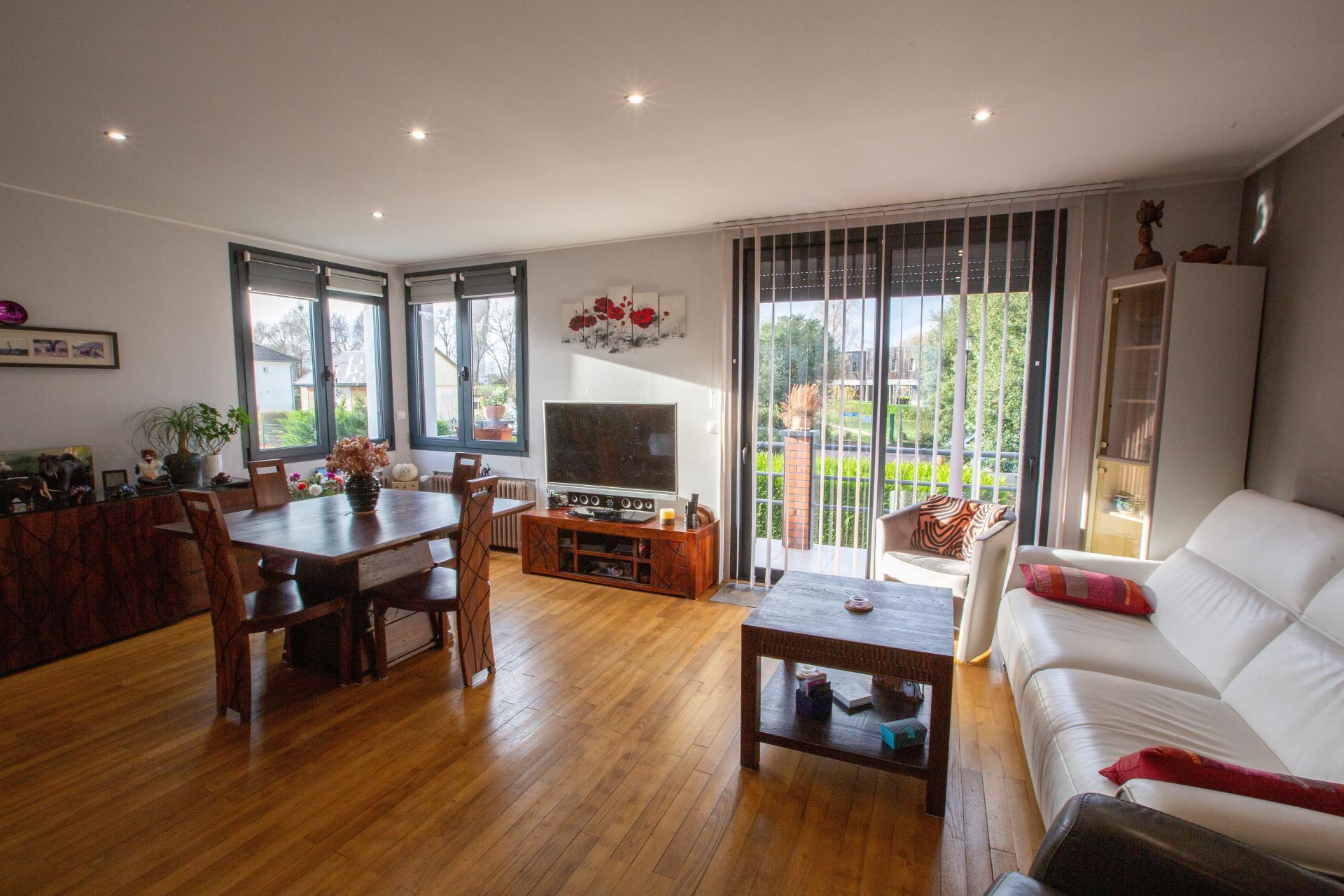 Séjour double lumineux avec grande baie vitrée coulissante ouvrant sur l’extérieur
