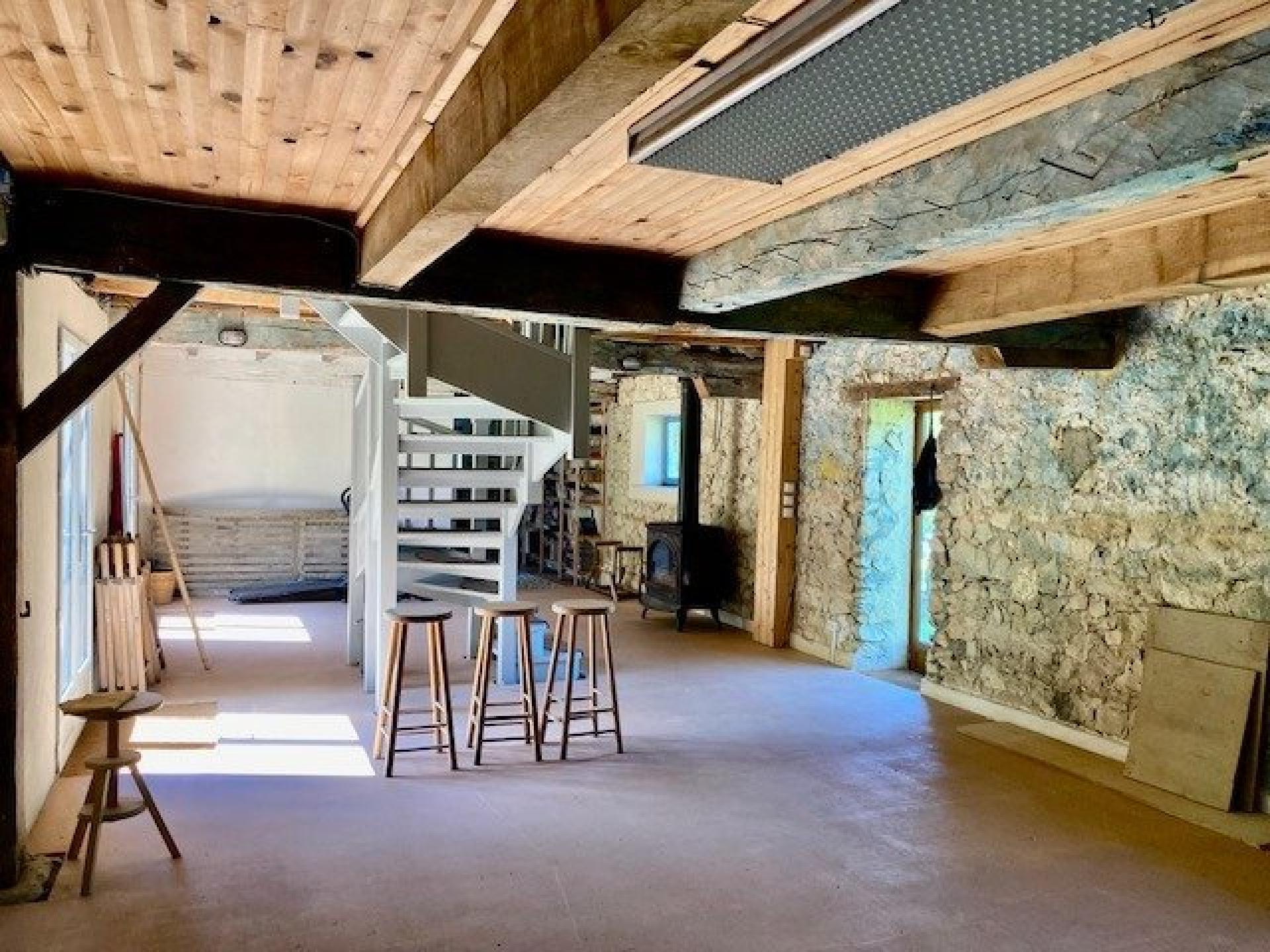 La maison comporte au rez-de-chaussée un séjour avec cheminée d'environ 28 m2, une salle à manger avec cuisine ouverte de 31 m2, un bureau / chambre de 15 m2, une grande chambre, salle de bain avec wc, une grande pièce en partie rénovée équipée d'un poêle à bois à aménager selon vos envies.