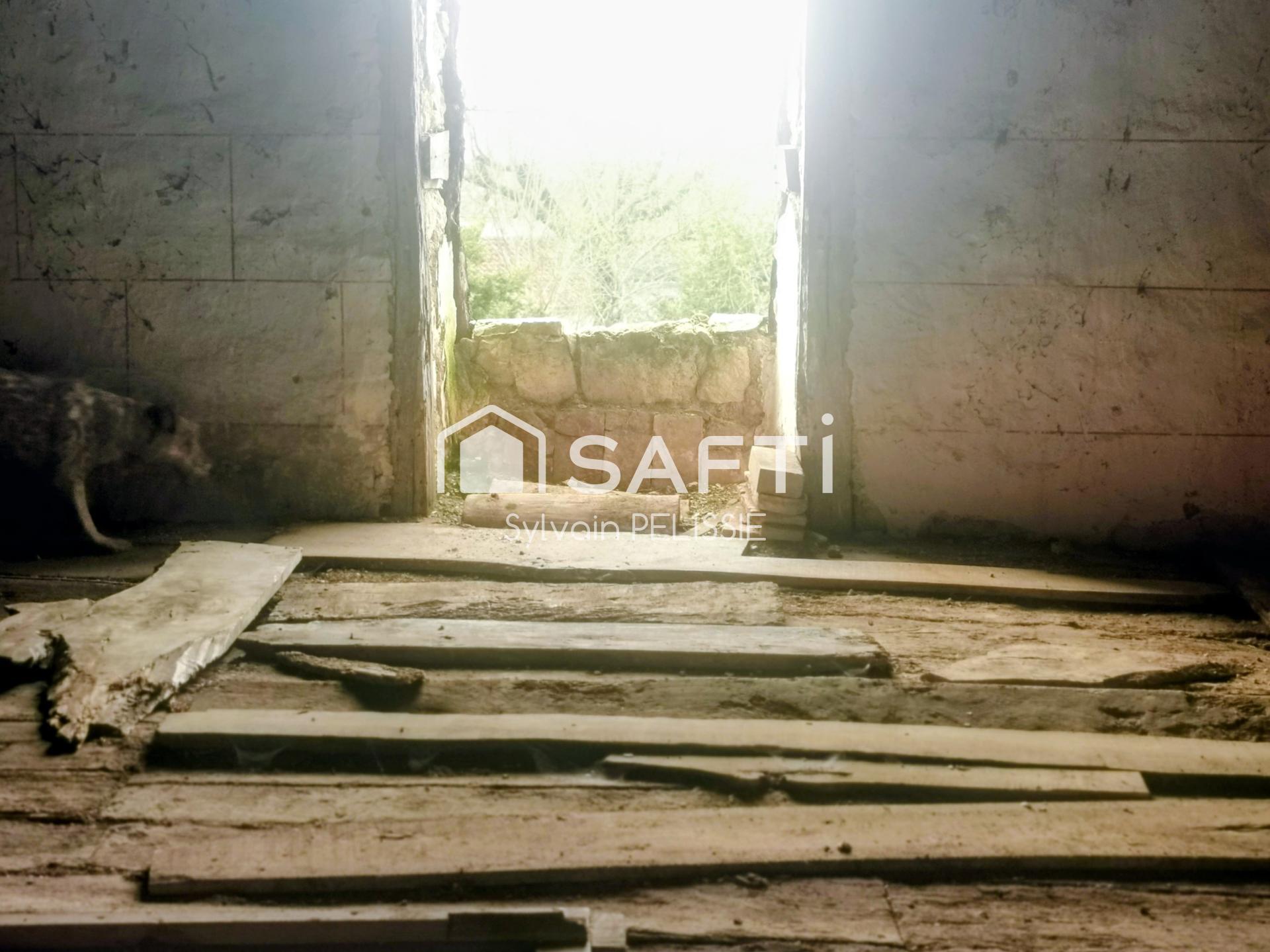 Les murs sont en pierre. La toiture est en place. À l’intérieur, sol en terre battue. Pas de fenêtres. Le volume reste brut. Tout est à créer.