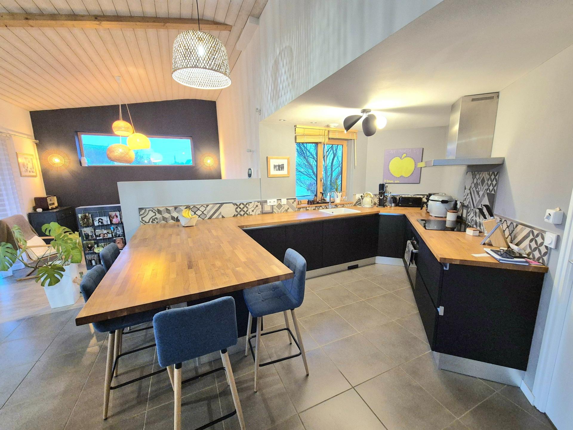 La maison comprend un hall d'entrée, un grand salon séjour lumineux, une cuisine ouverte équipée, trois chambres, un bureau, un cellier, une buanderie, deux salles de douches, un wc.