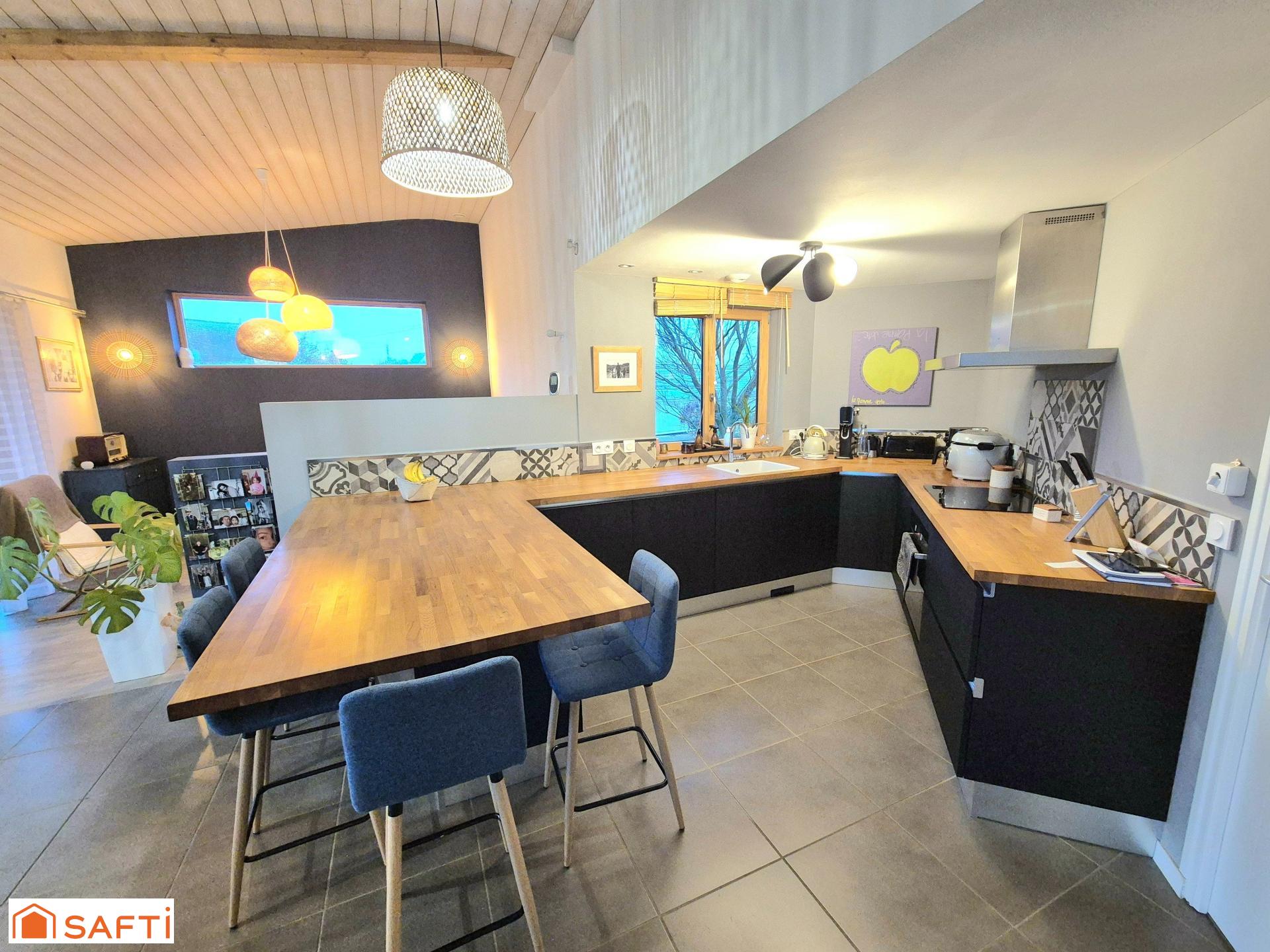 La maison comprend un hall d'entrée, un grand salon séjour lumineux, une cuisine ouverte équipée, trois chambres, un bureau, un cellier, une buanderie, deux salles de douches, un wc.
