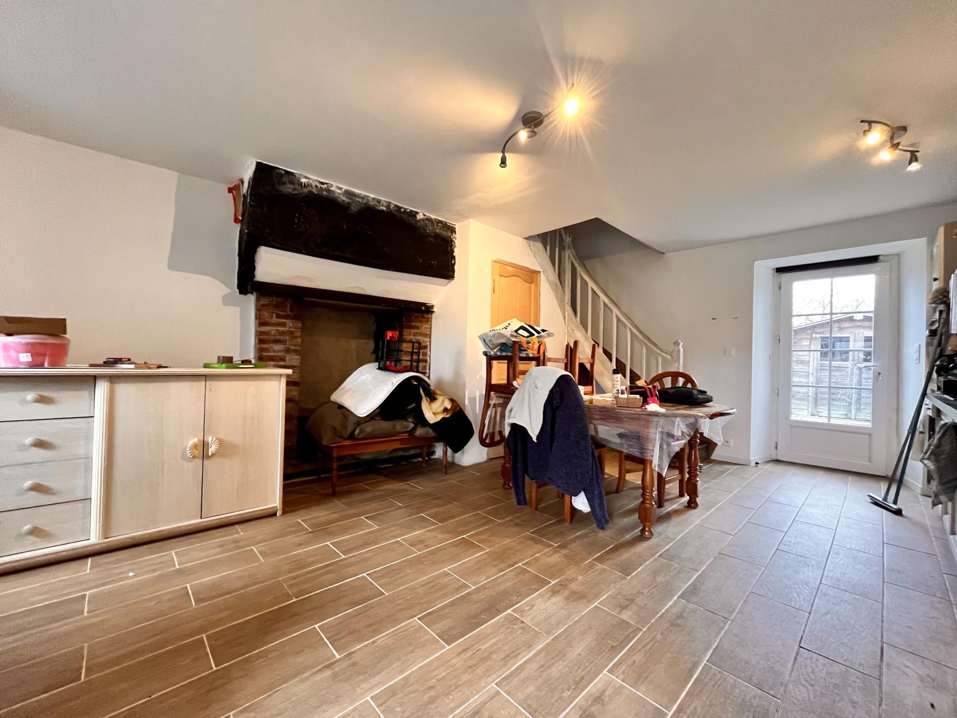Au rez-de-chaussée, une pièce de vie d’environ 25 m² accueille une cuisine aménagée ainsi qu’une cheminée à foyer ouvert. Le chauffage est assuré par des convecteurs électriques. Un WC indépendant complète ce niveau.