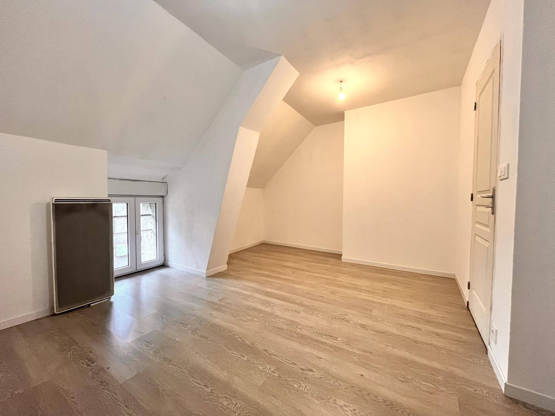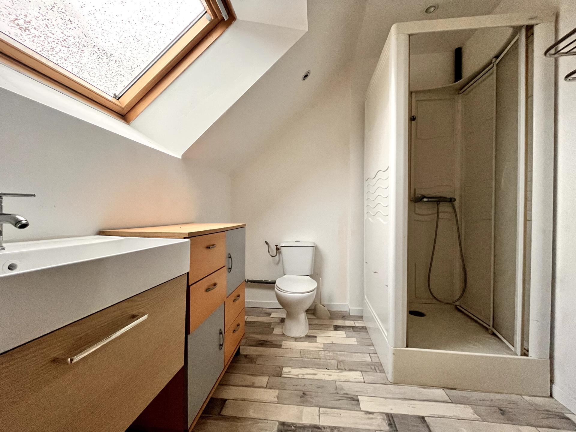 À l’étage, on retrouve une chambre d’environ 15 m² au sol, équipée de volets roulants électriques, ainsi qu’une salle d’eau avec douche, lavabo et WC.