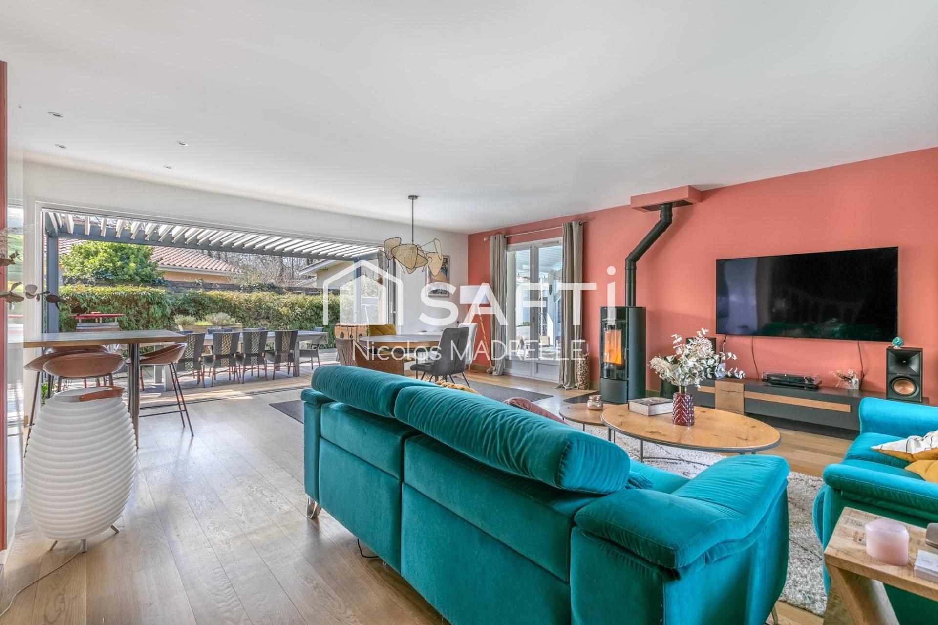 Implantée sur une parcelle paysagée de plus de 840 m², la maison dispose d’une piscine chauffée, de deux terrasses couvertes, d’une cuisine d’été de 20 m2, d'un chalet bois de 20 m2 pour le rangement ainsi que d'un carport avec prise pour véhicule électrique.