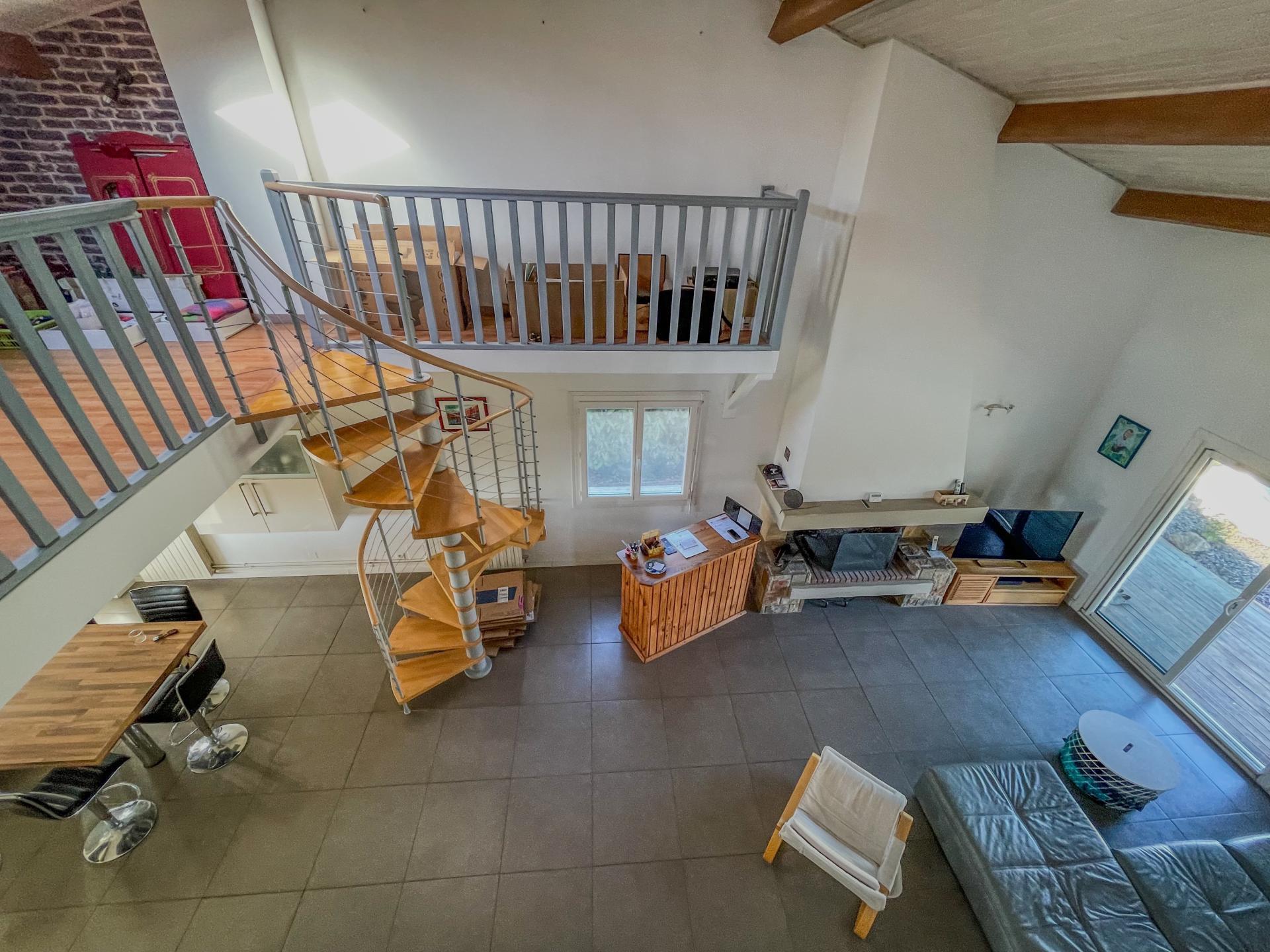 À l’étage, un escalier en colimaçon mène à une mezzanine polyvalente (bureau, salle de jeux, coin lecture, chambre d’amis) et à une chambre indépendante supplémentaire avec terrasse solarium surplombant le jardin et la piscine. Cet espace idéal pour un ado, une chambre d’amis ou encore un cocon parental, dispose d’un point d’eau avec WC et lavabo, et peut accueillir une future baignoire ou douche.
