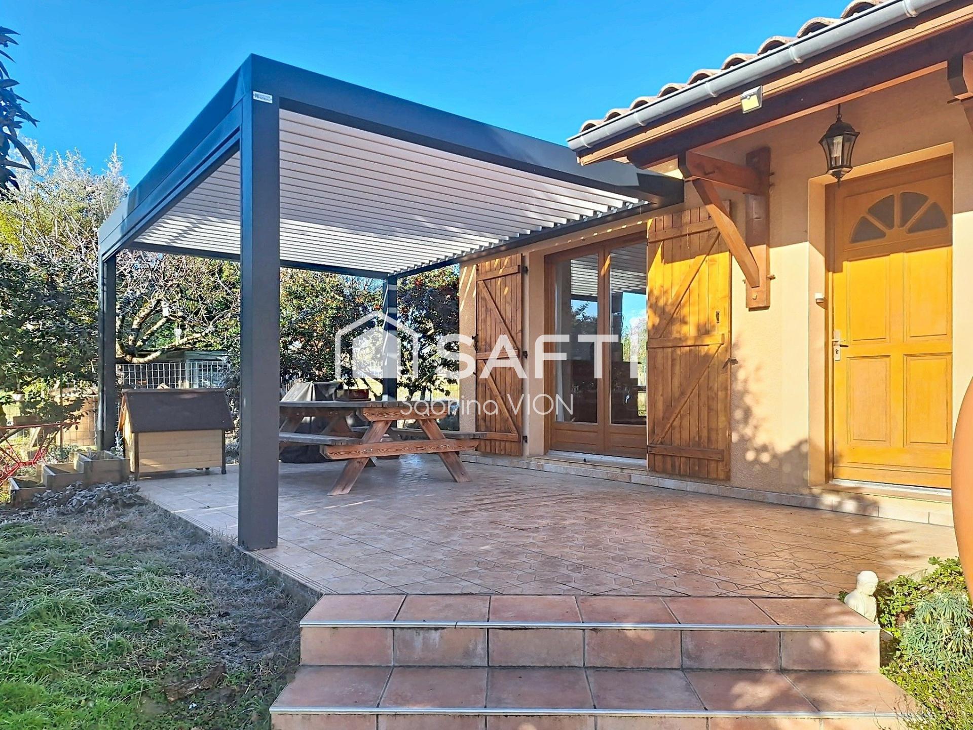 À l'extérieur, un carport, une terrasse avec sa pergola bioclimatique, ainsi qu'un abri de jardin complètent cet ensemble fonctionnel.