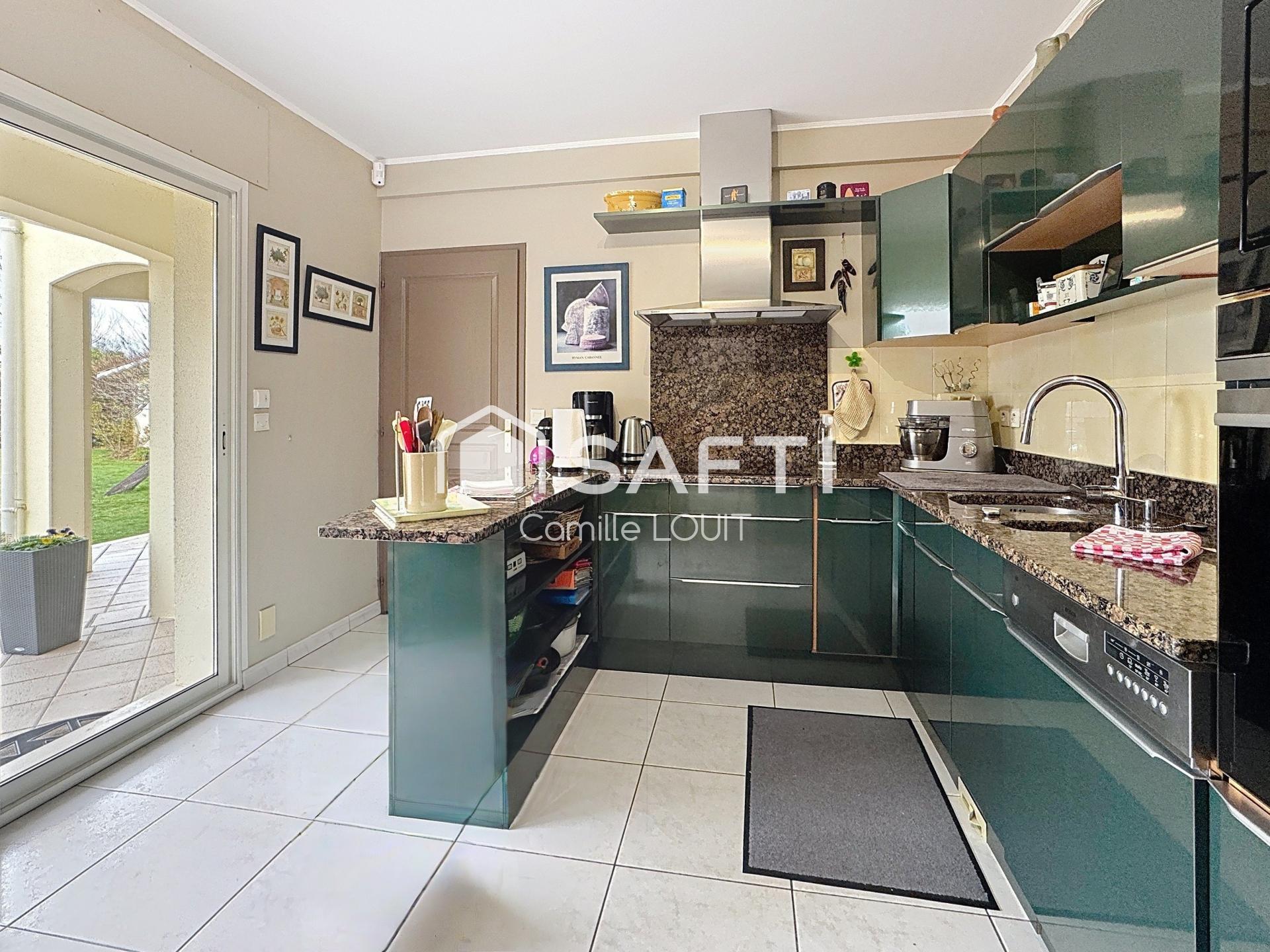 Implantée sur une parcelle d’environ 2 500 m², la maison dispose d’une piscine 10 x 5, d’un garage double et d’un atelier.