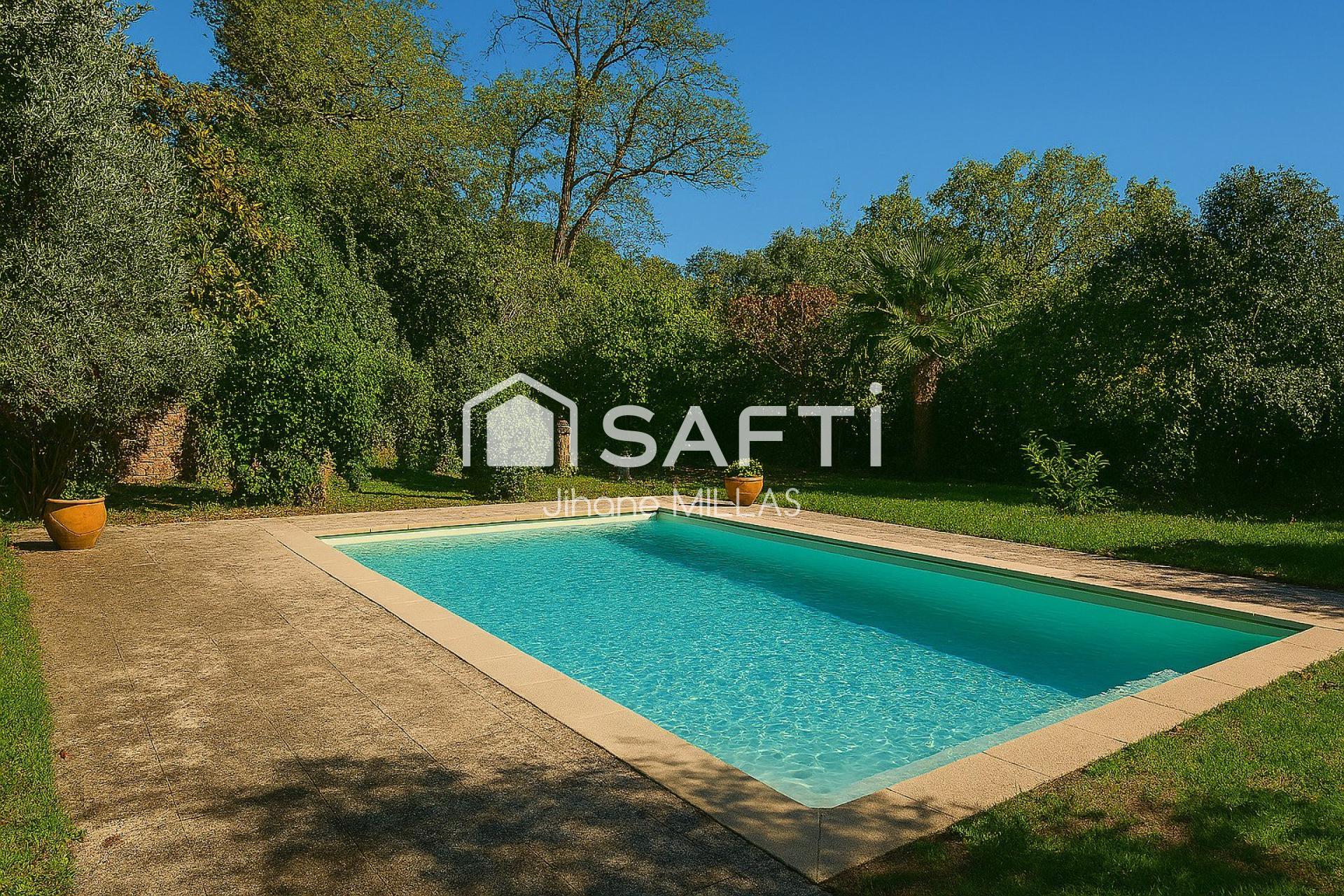À l’extérieur, le jardin arboré accueille une piscine 10x5, un balcon avec vue dégagée, un puits, ainsi qu’un garage et plusieurs espaces de stationnement (minimum 4 véhicules).