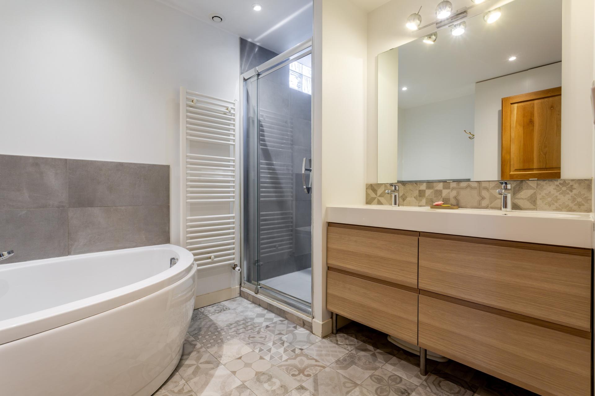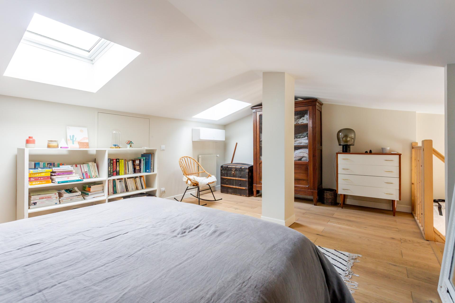 À l’étage, un pallier desservant deux chambres d'enfants , pouvant être réunis pour un seul et grand espace , une autre chambre, une salle d'eau avec baignoire et douche, des wc séparés, un large dressing accédant à la chambre parentale sous combles.