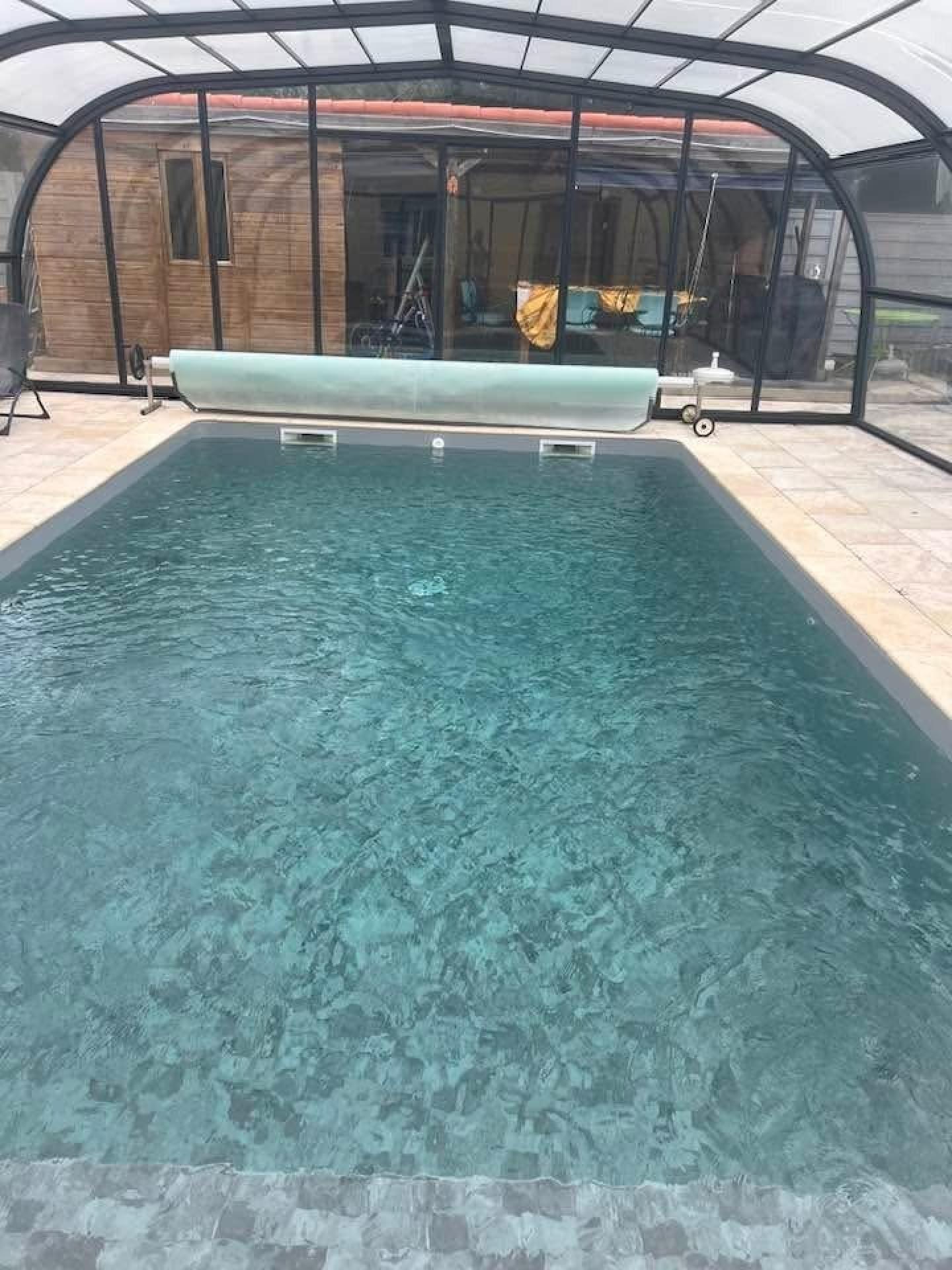 Une piscine sécurisée de 7m sur 4m avec une profondeur de 1,60 m, avec un liner datant de 2025 et une filtration au sel.