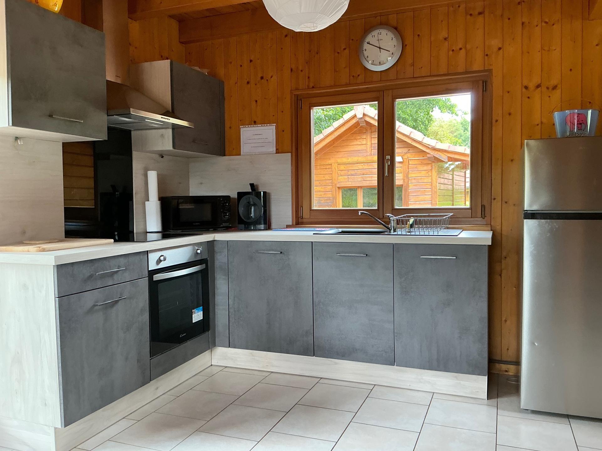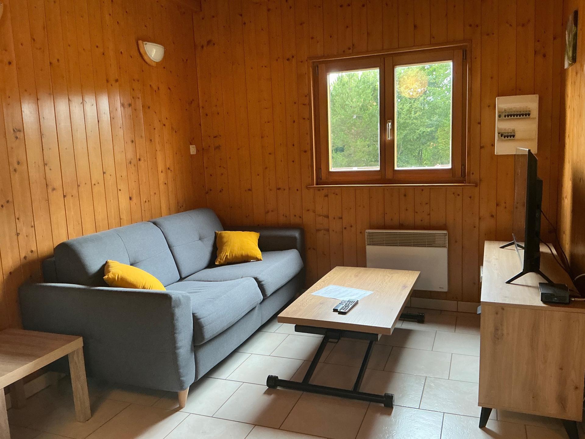 Ce chalet se compose à l intérieur d’un séjour avec salle d’eau et wc, et à l ‘étage, d’une mezzanine avec 2 chambres .Le séjour vous donne accès à une terrasse couverte avec barbecue et vue sur l ‘étang.
