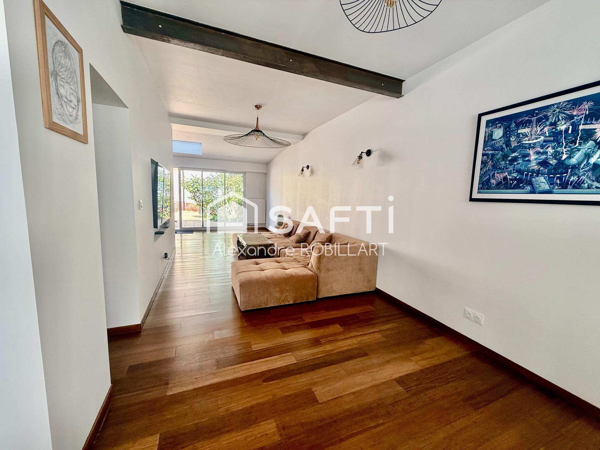 Quant à l'intérieur, la maison a été entièrement rénovée et offre au rez-de-chaussée un salon/séjour lumineux, une cuisine équipée moderne et un WC.