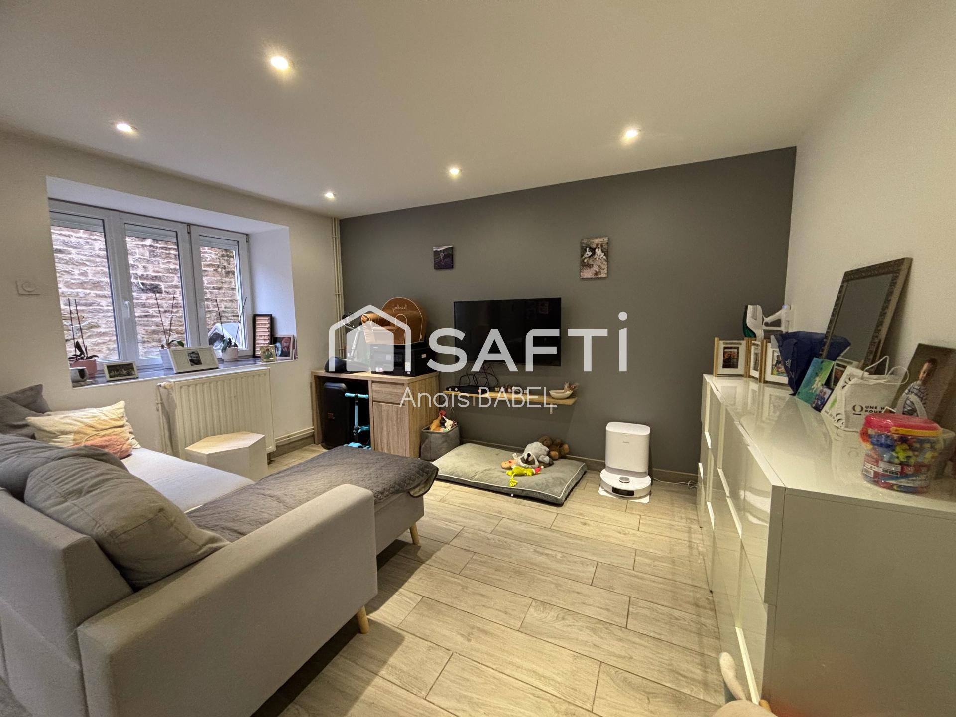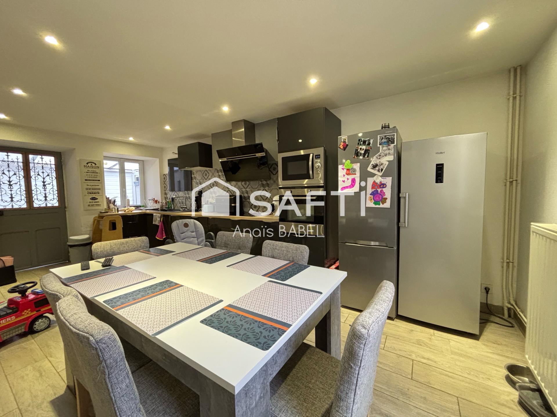 Maison de 90 m², 2 chambres, salon-séjour lumineux avec cuisine ouverte, cave voûtée, grenier, village viticole et commerces.