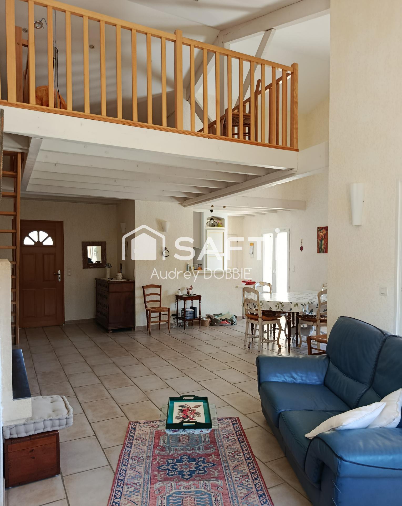Édifiée en 2005, cette maison de plain-pied propose une spacieuse pièce de vie ( 50m²) baignée de lumière, réunissant salon, salle à manger et cuisine, complétée par un cellier. L’espace nuit comprend une chambre parentale, une seconde chambre, une salle d’eau et des WC indépendants. À l’étage, une mezzanine d’environ 12 m² dessert un bureau pouvant également faire office de chambre supplémentaire.