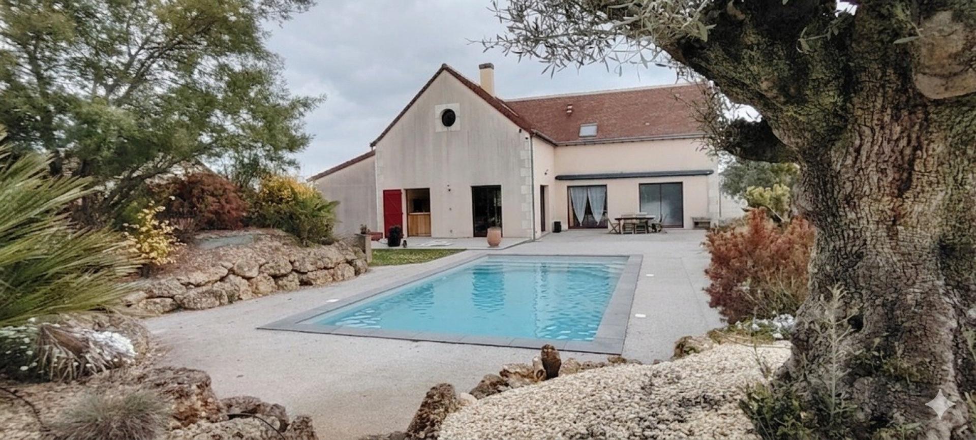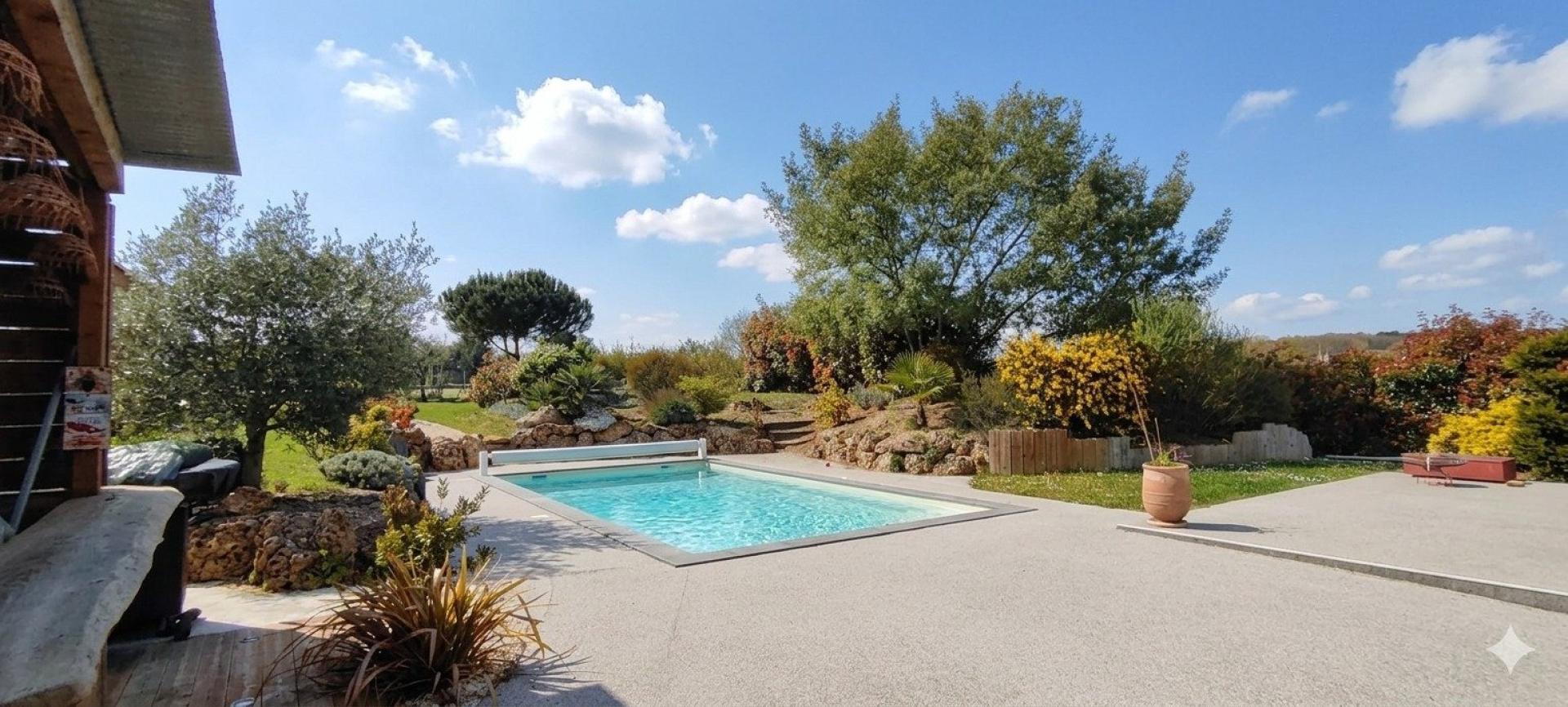 À l’extérieur, le terrain entièrement paysagé invite à la détente : piscine 8 x 4 avec volet électrique, pool house, grande terrasse en résine, store banne, espace idéal pour profiter des belles journées ensoleillées. Un terrain de pétanque complète cet ensemble convivial.