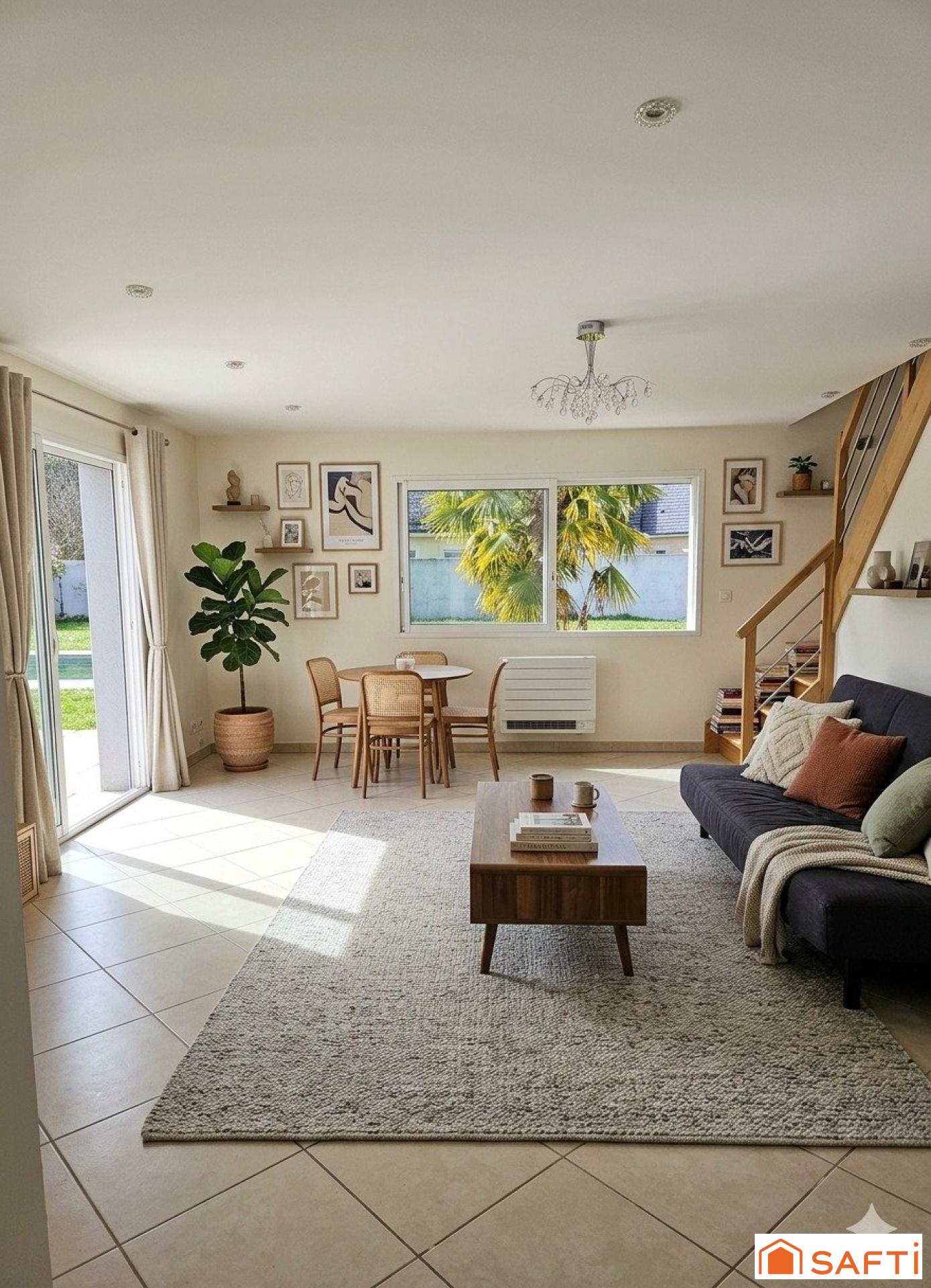 Au rez-de-chaussée, vous trouverez une grande pièce de vie lumineuse avec cuisine ouverte et espace repas, idéale pour partager des moments en famille.