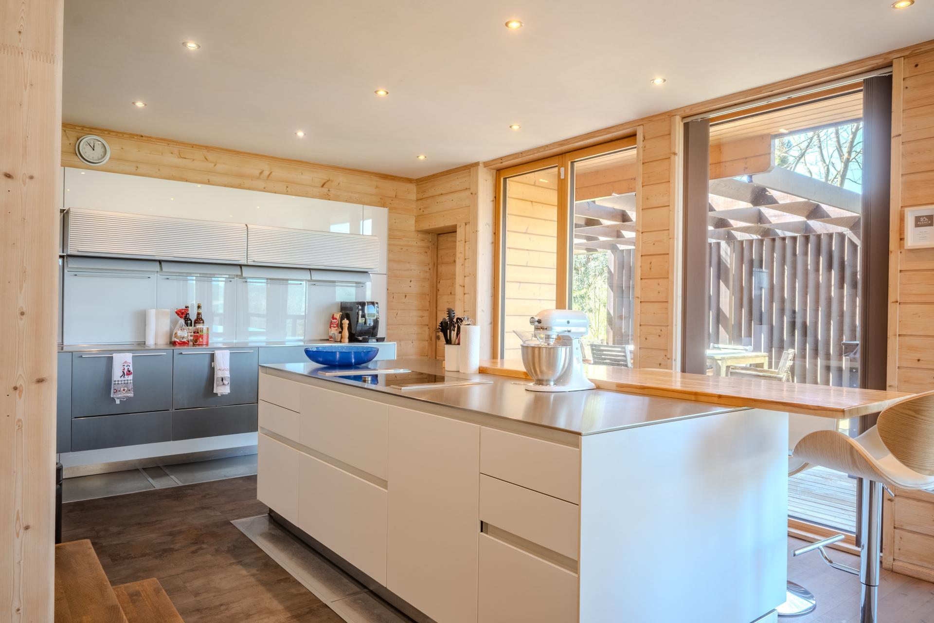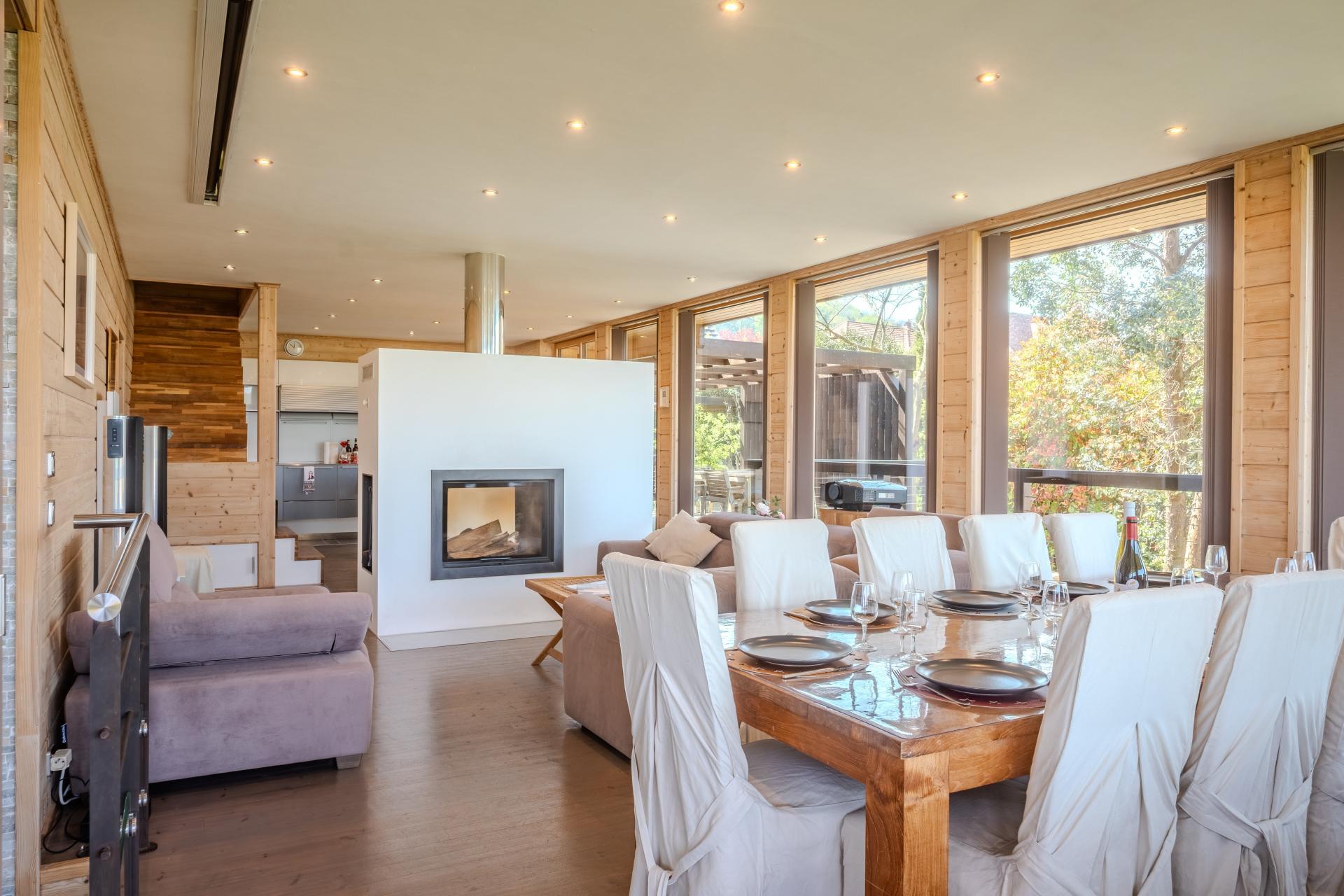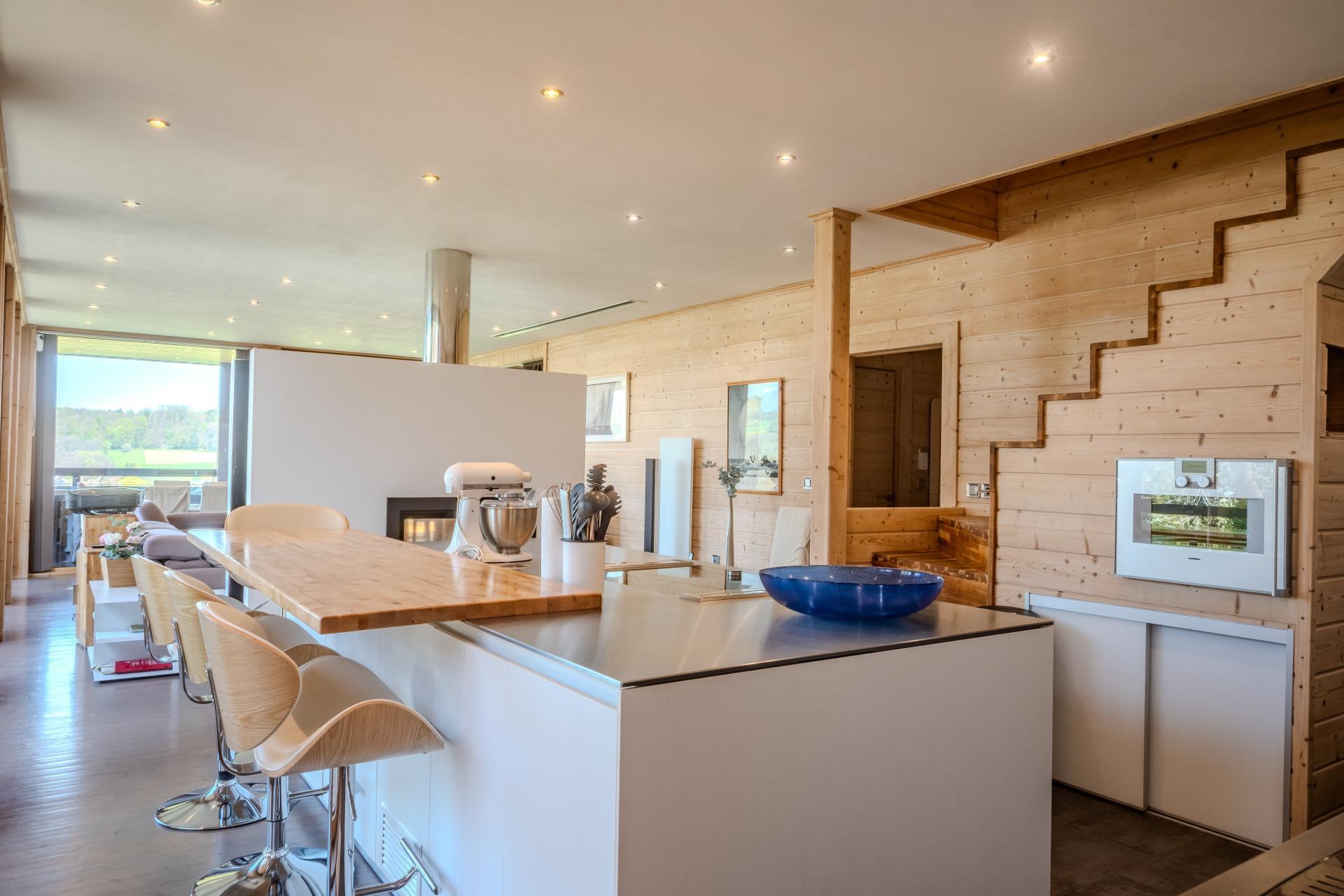 À l’intérieur, les volumes se révèlent particulièrement généreux et baignés de lumière. Les espaces de réception s’organisent autour d’un vaste séjour et d’une cuisine entièrement équipée, créant un lieu de vie convivial et ouvert sur les terrasses.