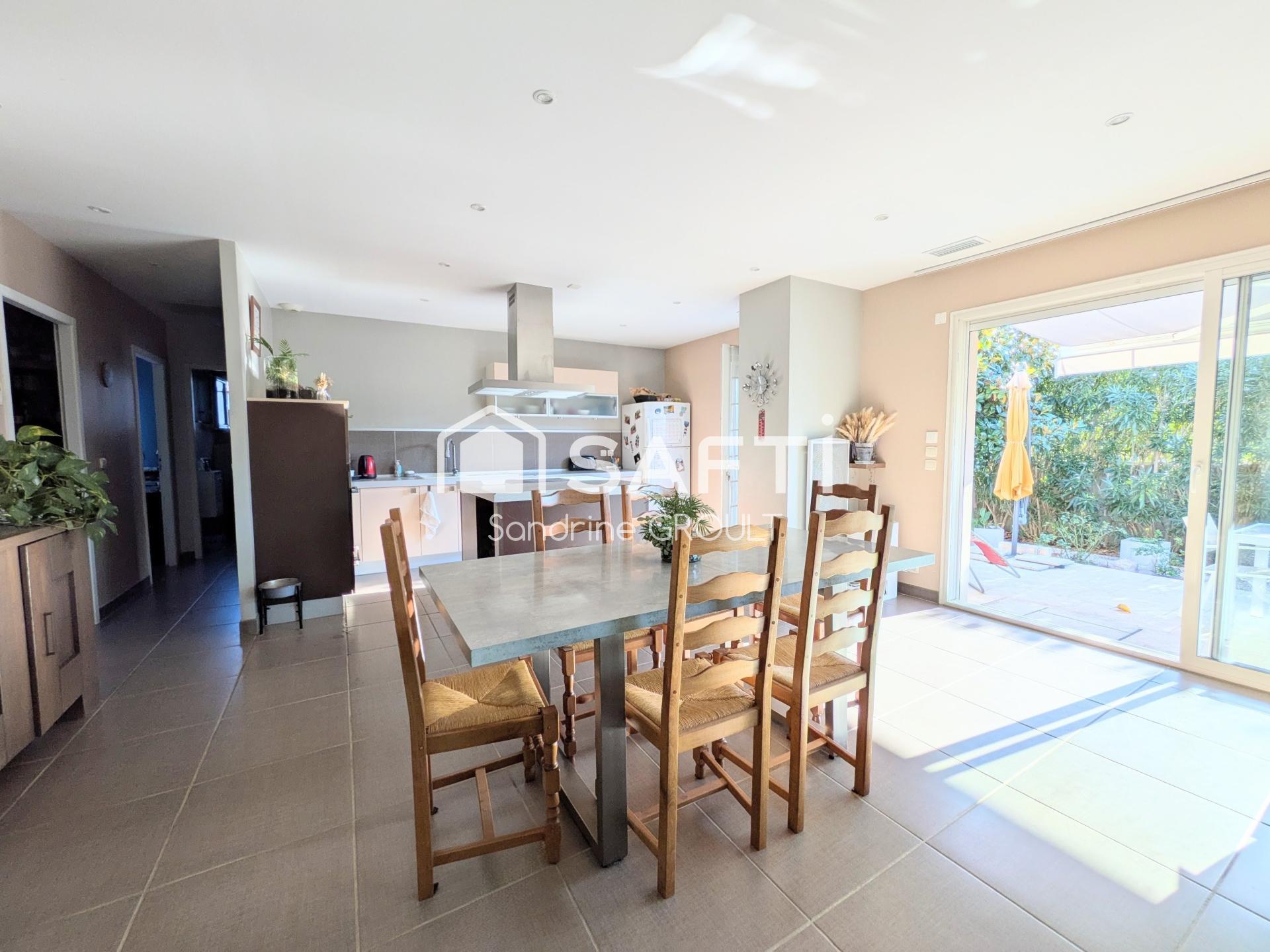 À l'intérieur, la maison de plain-pied de 124 m² climatisée propose un séjour lumineux avec une cuisine ouverte. Les 6 pièces comprennent 4 chambres équipées de placards, dont une avec salle d'eau, 1 salle de bains avec douche italienne et baignoire balnéo, ainsi qu'un bureau avec un accès indépendant pour le travail à domicile. Enfin, la maison dispose d'une buanderie, d'un garage carreler, isolé avec mezzanine, deux places de parking extérieures.