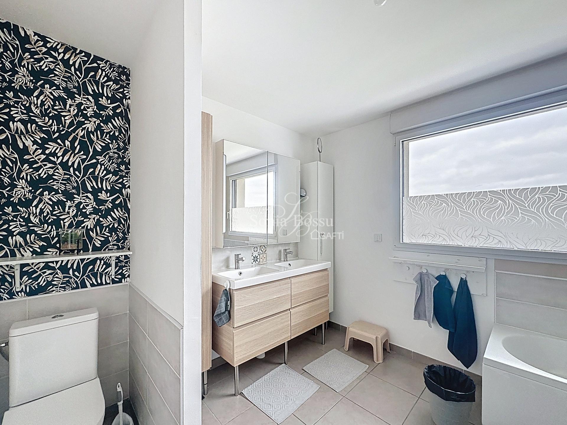 Vous apprécierez également la salle de bain de belle taille (plus de 10m2) avec double vasques, baignoire, douche et WC.