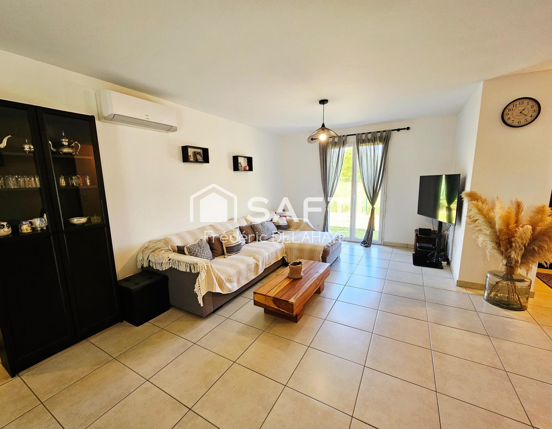 Elle se compose d’une entrée avec placard et WC, ouvrant sur une belle pièce de vie lumineuse avec cuisine ouverte, offrant un accès direct au garage attenant.