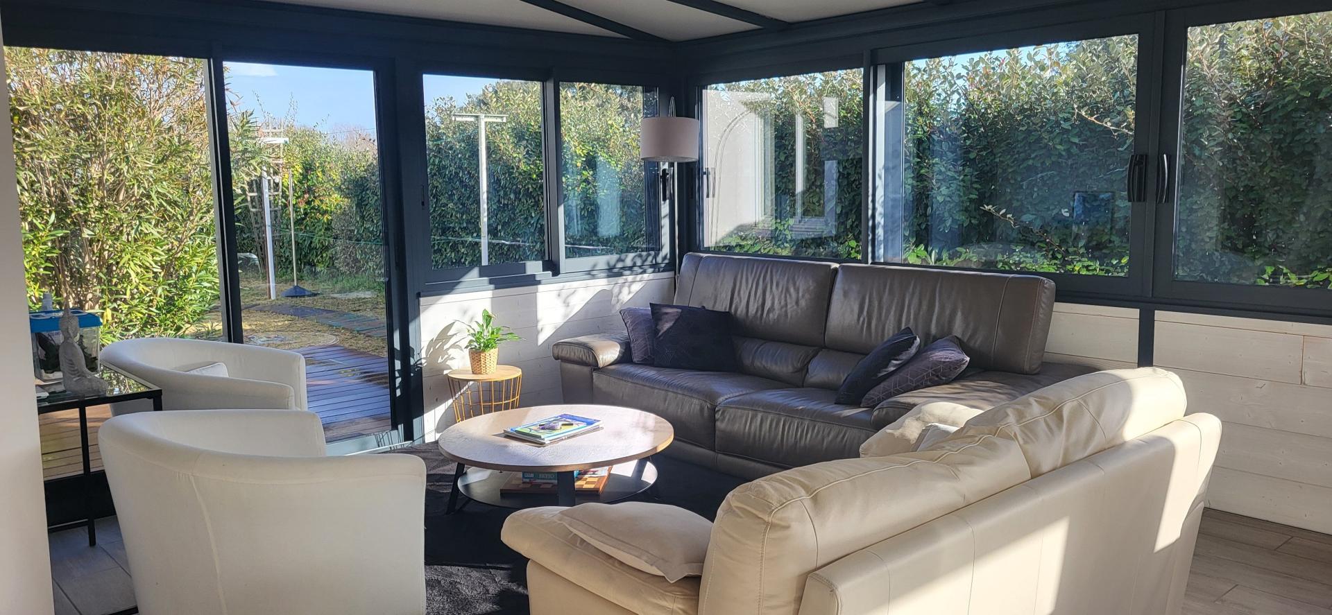 La pièce de vie exposée plein sud bénéficie d’une belle luminosité naturelle et d’un accès direct aux terrasses et au jardin.