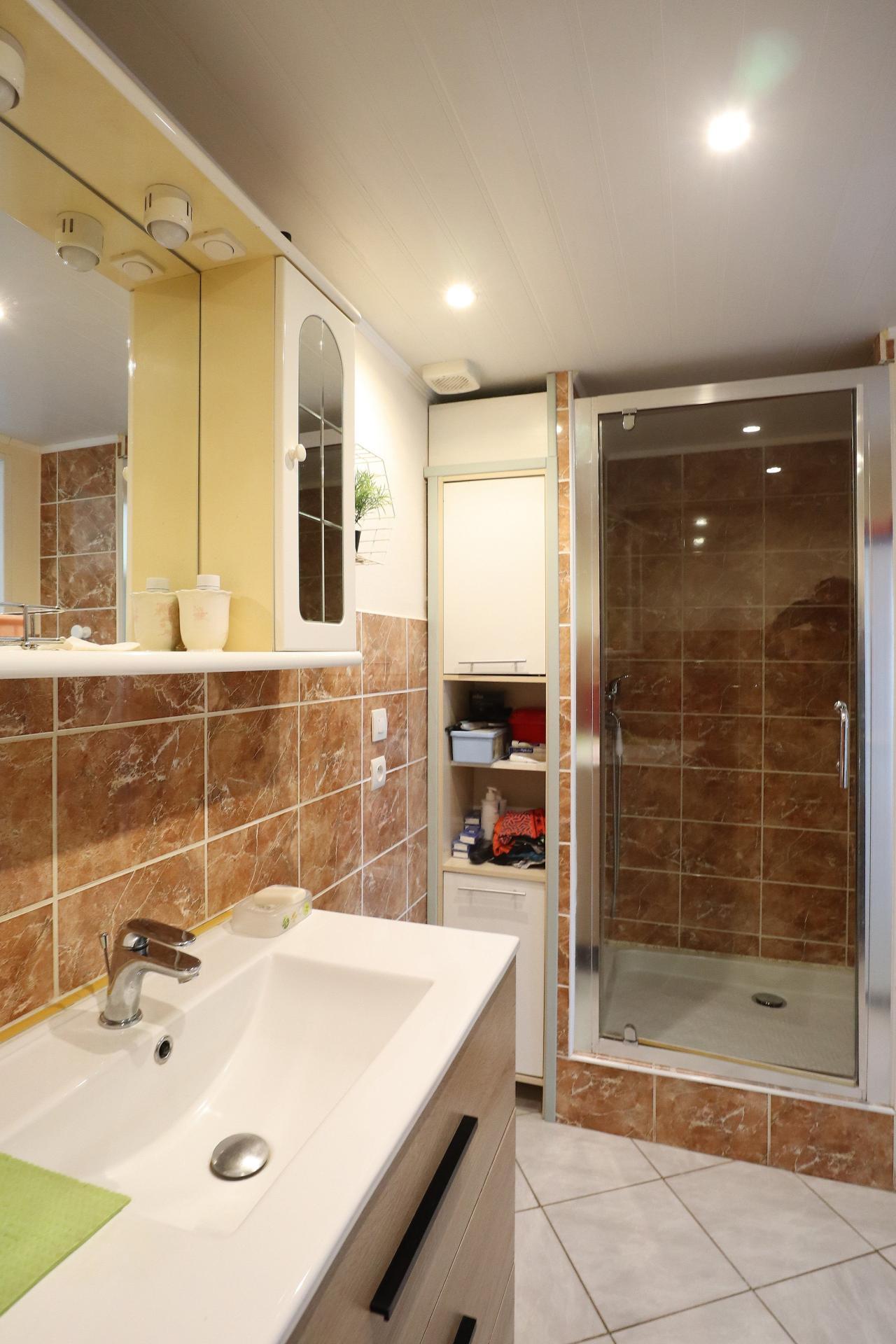Au rez de chaussée, vous disposez d'1 cuisine dinatoire, 1 séjour/salle à manger spacieux et lumineux, 1 salle d'eau avec wc séparés, 1 chambre de 20m2 avec placards.