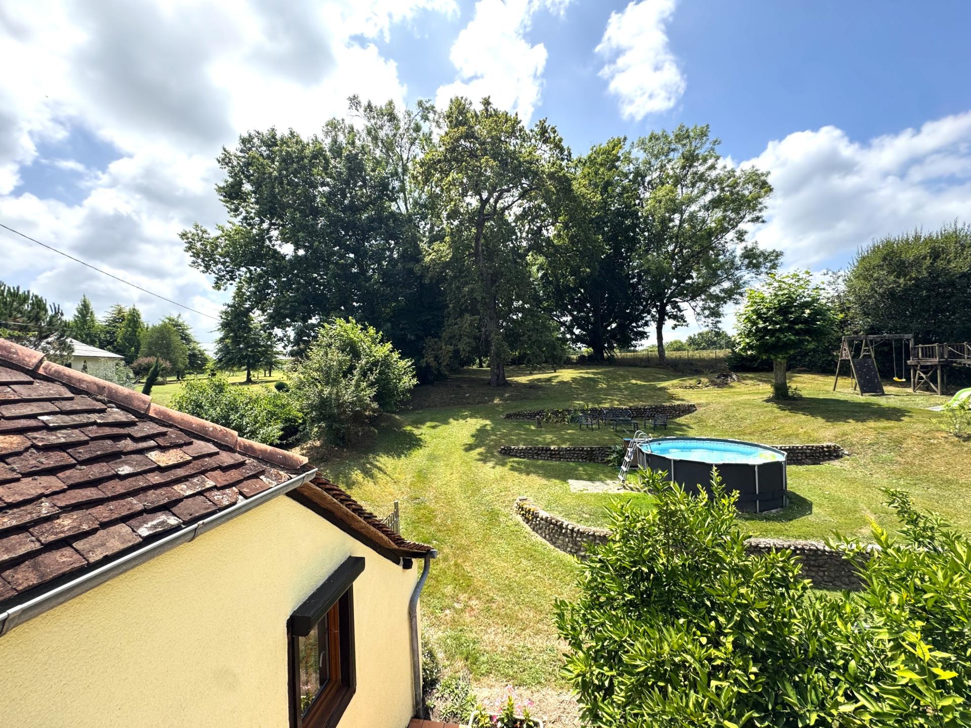 Terrasse carrelée, jardin entièrement clôturé, avec arbres fruitiers, coin potager avec un point d'eau collectant l'eau de pluie, local outils de jardin, grand poulailler bien délimité, piscine hors sol de 3.50m de diamètre.