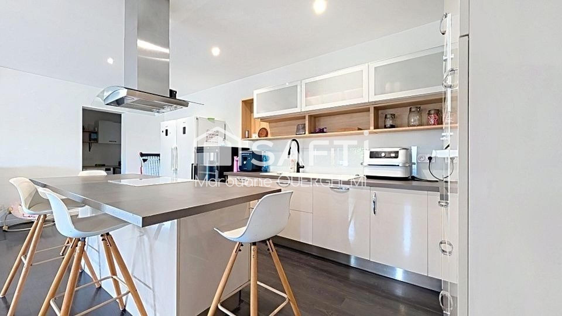 La pièce de vie spacieuse accueille une cuisine ouverte entièrement équipée, avec cellier attenant et buanderie, apportant un véritable confort au quotidien.