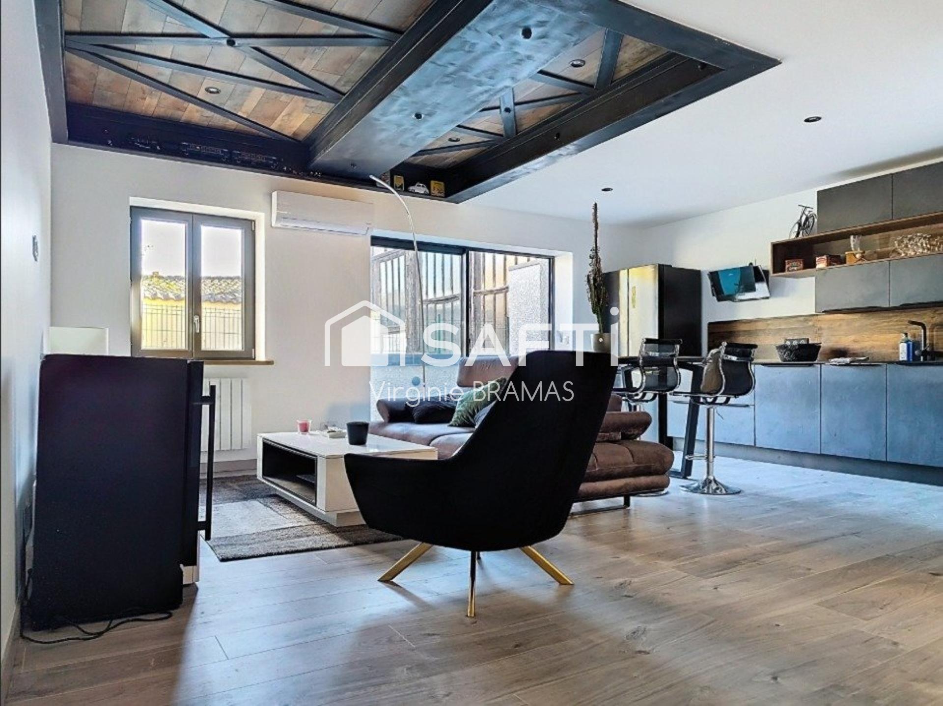 À l’étage, la maison propose une pièce de vie lumineuse, ouverte sur une terrasse, propice aux moments de convivialité.