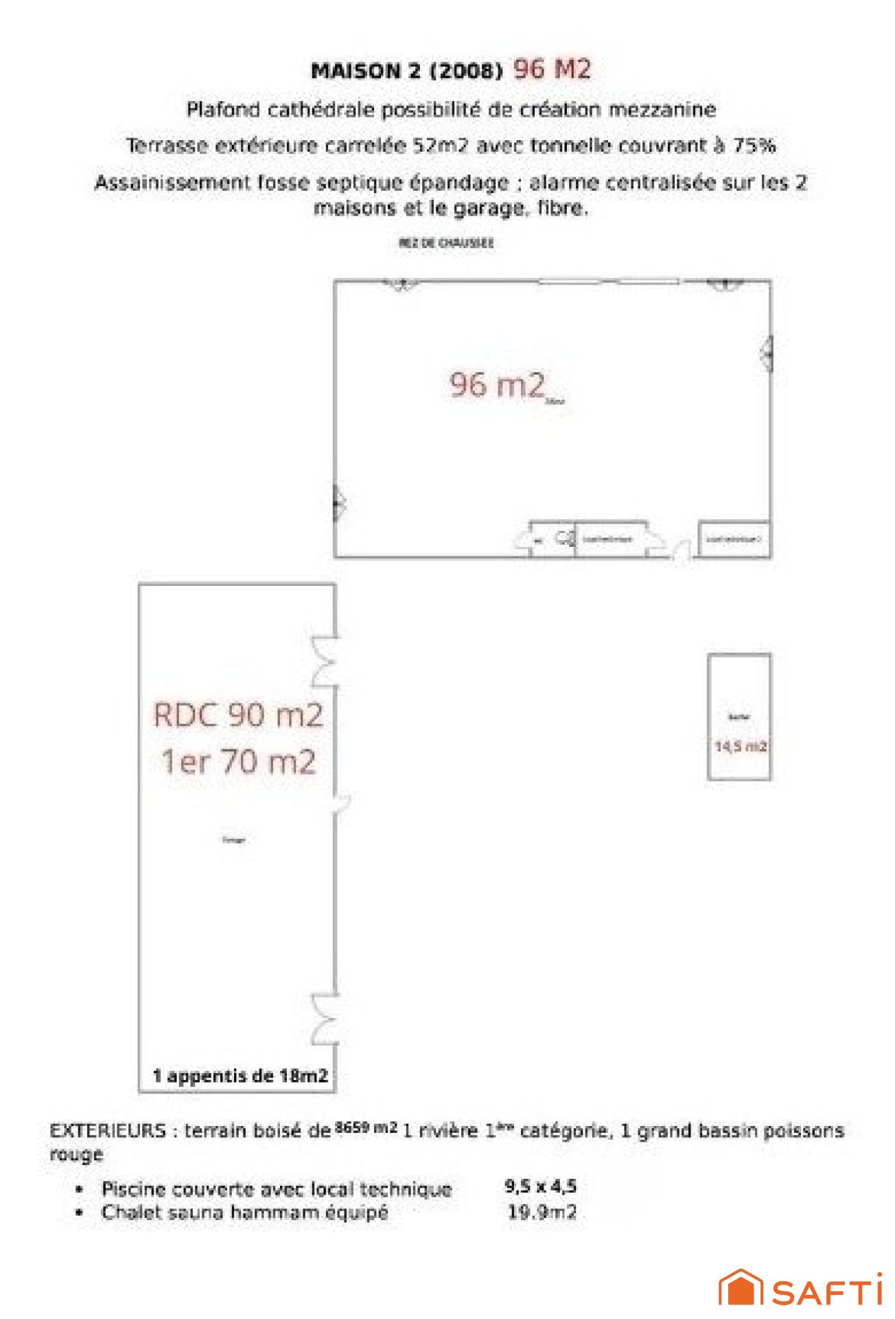 piscine couverte (9,5 x 4,5 m) Sauna de 20 m², bassin et rivière de 1ère catégorie dans la propriété, dépendance aménageable 20m2 (bureau, atelier, etc.), deux grandes terrasses (30 m² et 52 m²), grand garage de 140 m² isolé, sur 2 niveaux, appentis de 18 m²,