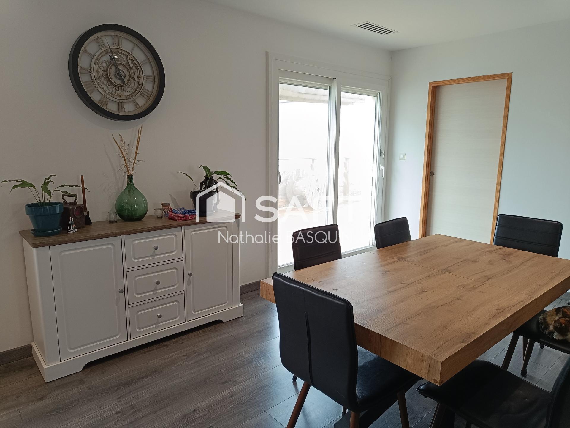 Décoration soignée et contemporaine avec une belle luminosité grâce à une baie vitrée donnant sur une terrasse bois avec pergola orientée sud.