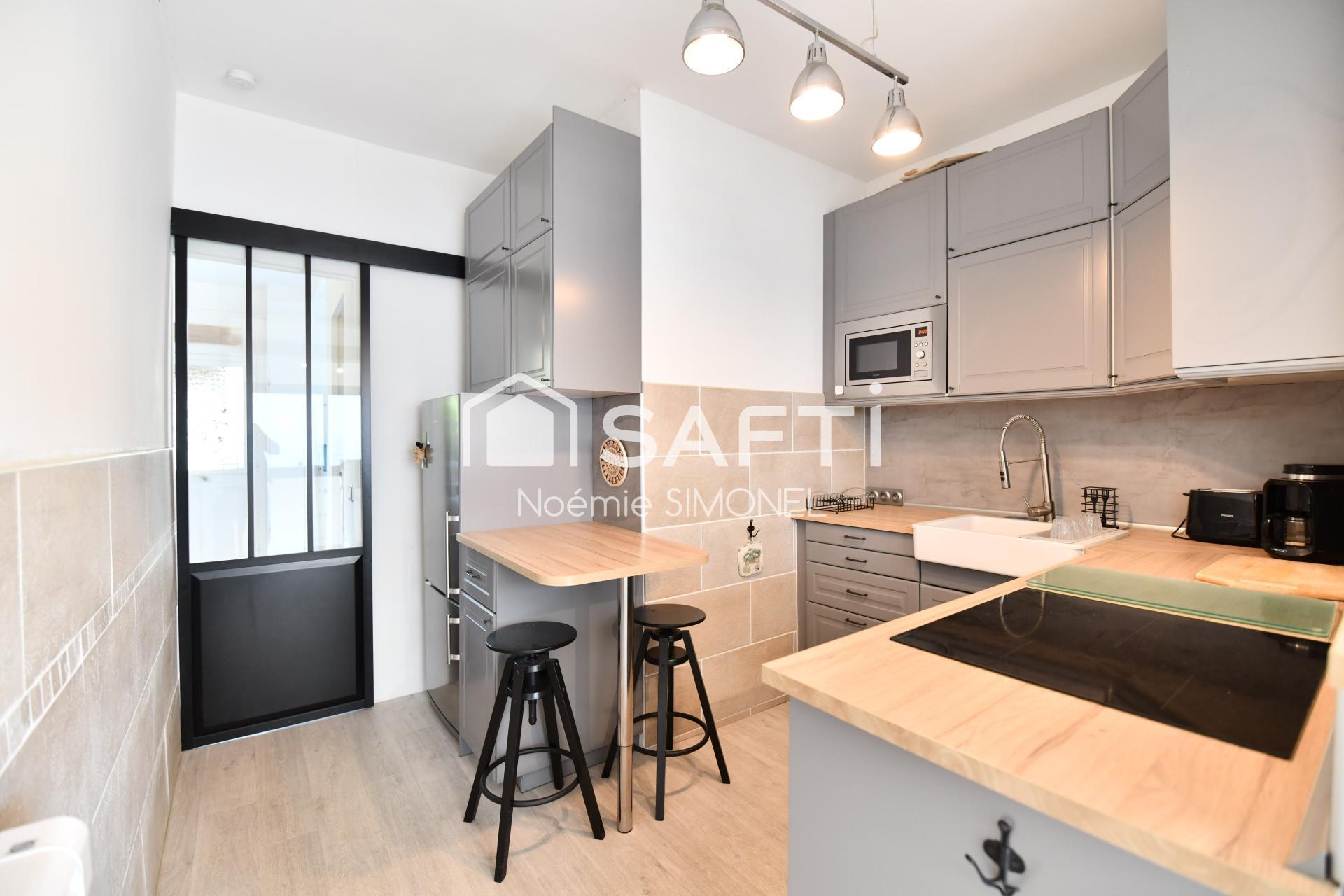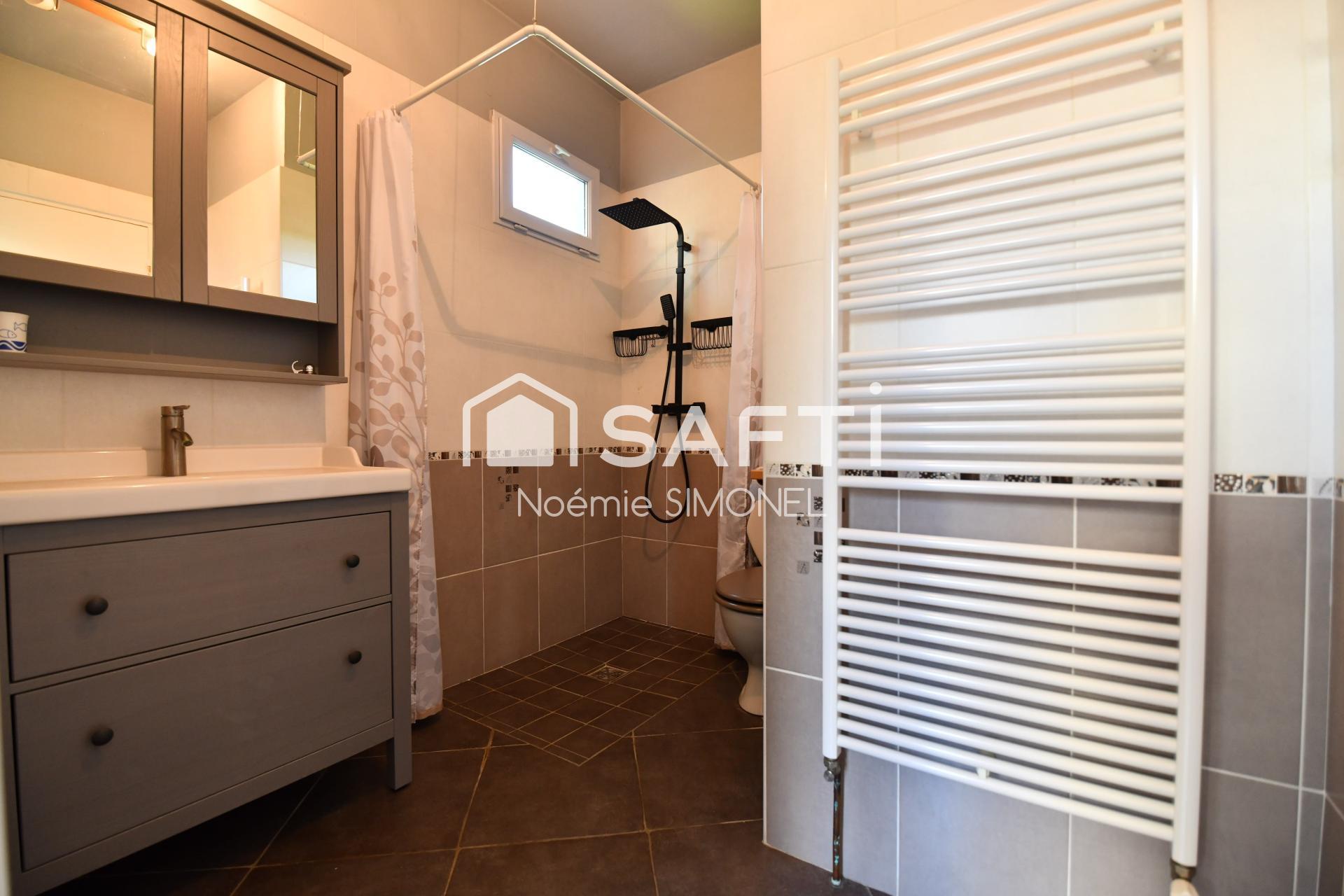 - une entrée, un salon bien exposé avec un poêle à granules, une chambre, une salle d'eau entierement rénovée et une cuisine contemporaine.