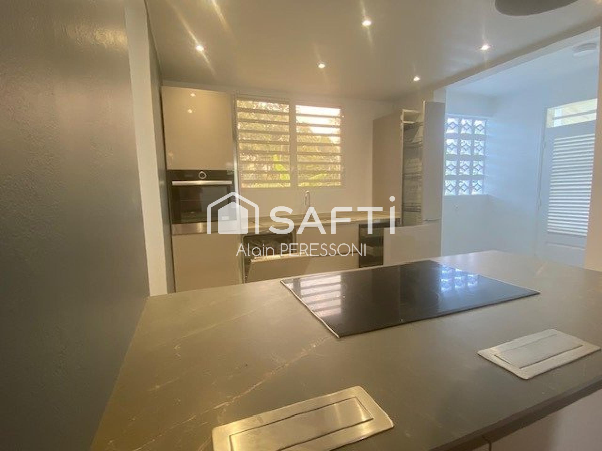 En Guyane à Matoury, sur le point haut de Morthium, SAFTI vous propose une maison accueillante de 6 pièces, dont l'intérieur est entièrement rénové et les équipements neufs. Une très belle cuisine, neuve, moderne et équipée s'ouvre sur le salon puis la terrasse avant. Deux chambres (~16m2) avec salles d'eau privatives - WC composent le bas, en plus des Wc du hall d'entrée. Le haut, c'est une pièce de 40m2 divisible en 2 chambres. Une salle de bains WC, un bureau, des rangements et un espace bibliothèque/bureau/petit salon: à définir ! Tout est neuf sous la toiture, y compris l 'assainissement, l'électricité, la plomberie, les sanitaires, douches, mobilier de cuisine ....
